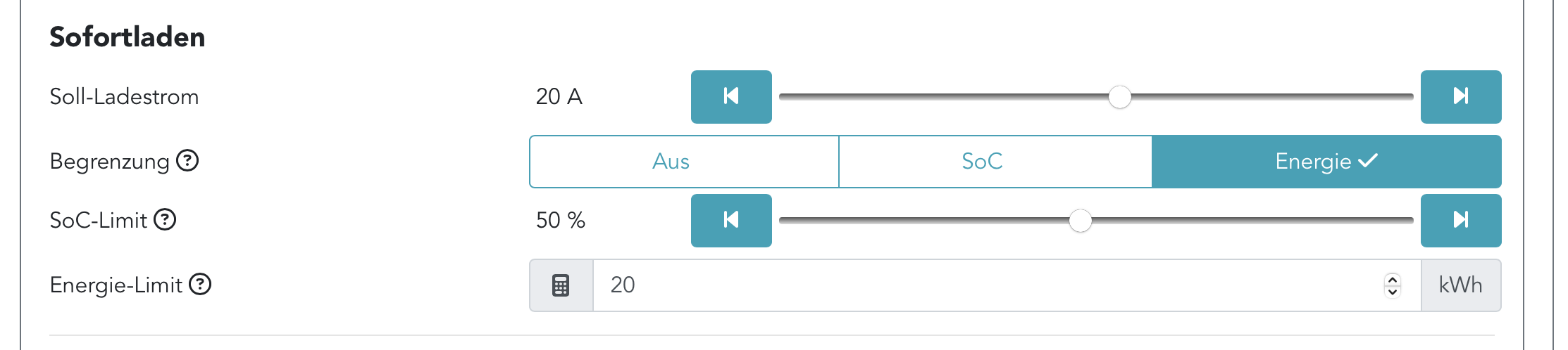 Was mache ich falsch? In der Box wurde Sofort-Laden gestartet und anschließend das Limit von zuvor 30 auf 20 kWh reduziert. Verträgt sie das nicht? Muss der Wert von dem Lade-Start eingestellt sein?