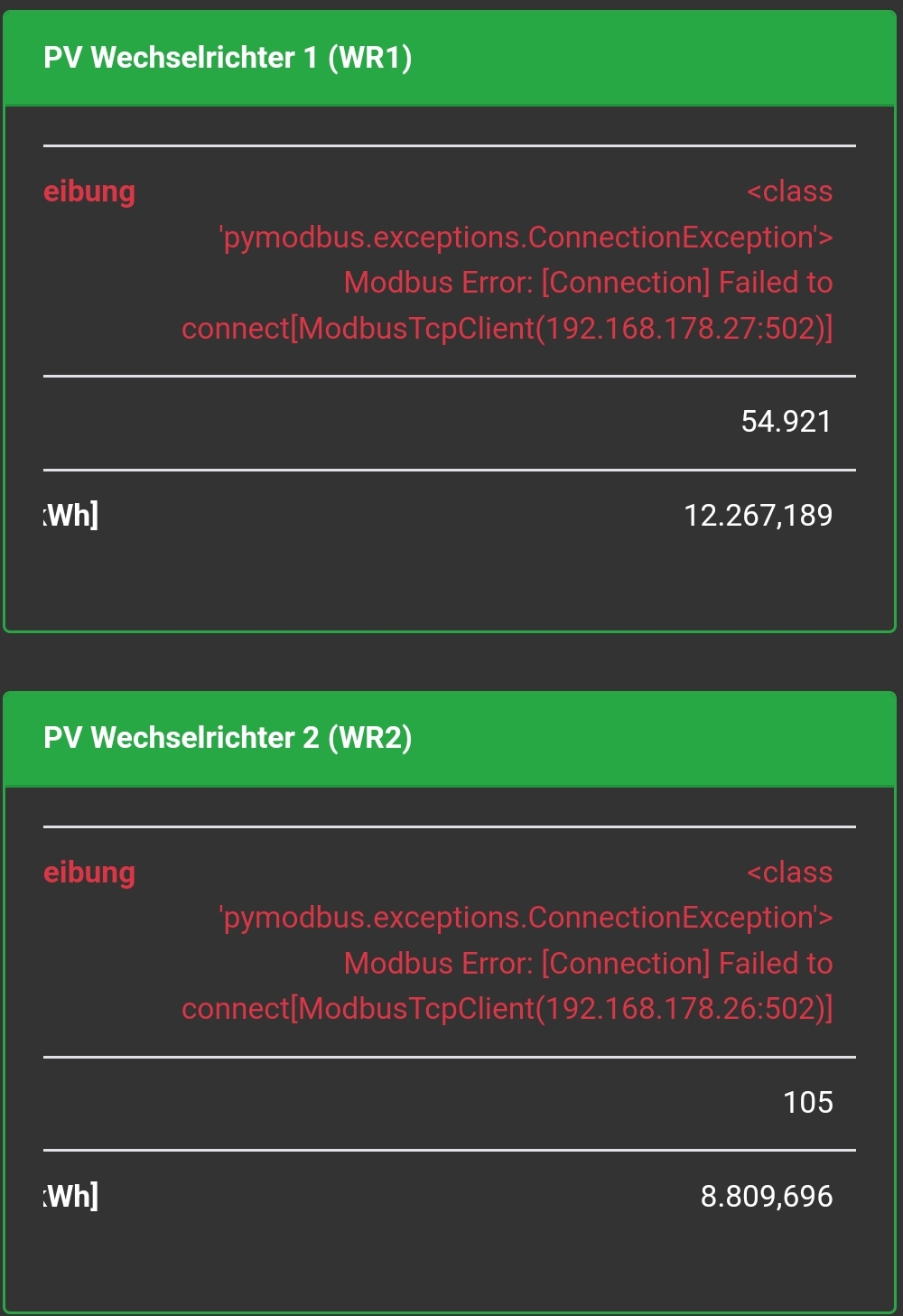 Jetzt gab es gestern das Problem, dass einer der Wechselrichter ein Problem mit seinem WLAN hatte und die Abfrage per modbus durch die openwb nicht mehr funktioniert hat. Das war in der normalen Anzeige nicht zu erkennen, da der andere wechselrichter weiter Werte lieferte und auch der letzte abgefragte Wert des anderen Wechselrichters immer noch dazu addiert wurde.