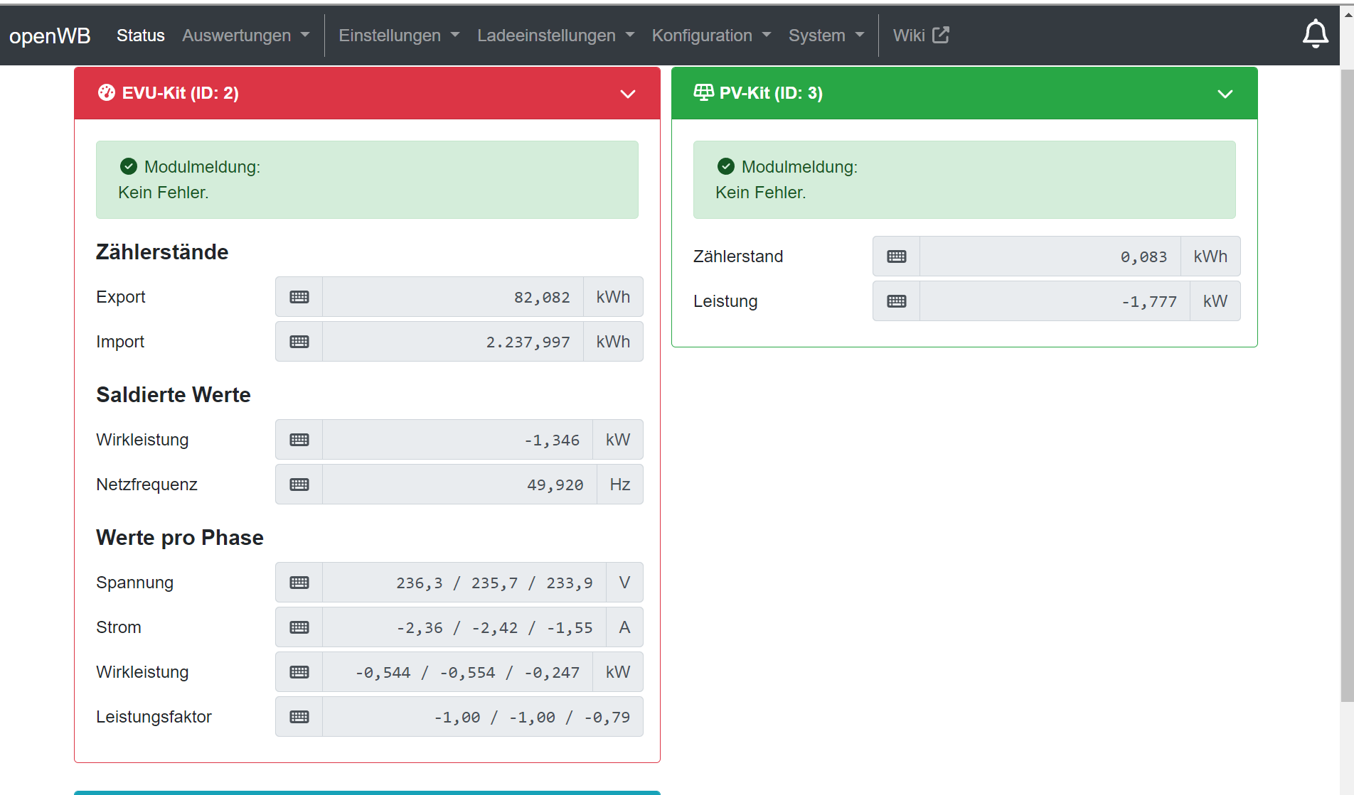 Allerdings werden trotz Einspeisung die Heiztstäbe nicht eingeschaltet. Der PV Wert bleibt allerdings immer bei 0 und zeigt im PV Modul die Leistung invertiert, also negativ an. Ich vermute die Stromflussrichtung am PV Modul ist verkehrt herum.