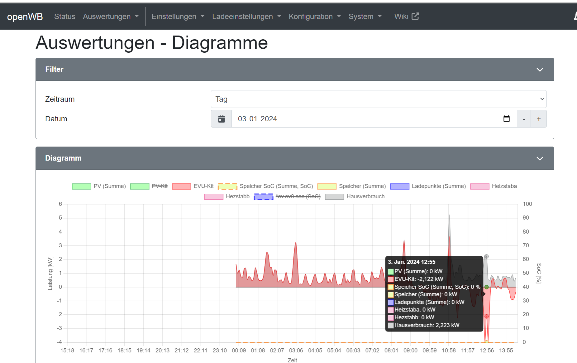ich habe ein OpenWB Standalone Version 2 (2024-01-03), die mittels EVU Kit und PV Kit zwei Heizstäbe bei Überschuss nacheinander einschalten soll.