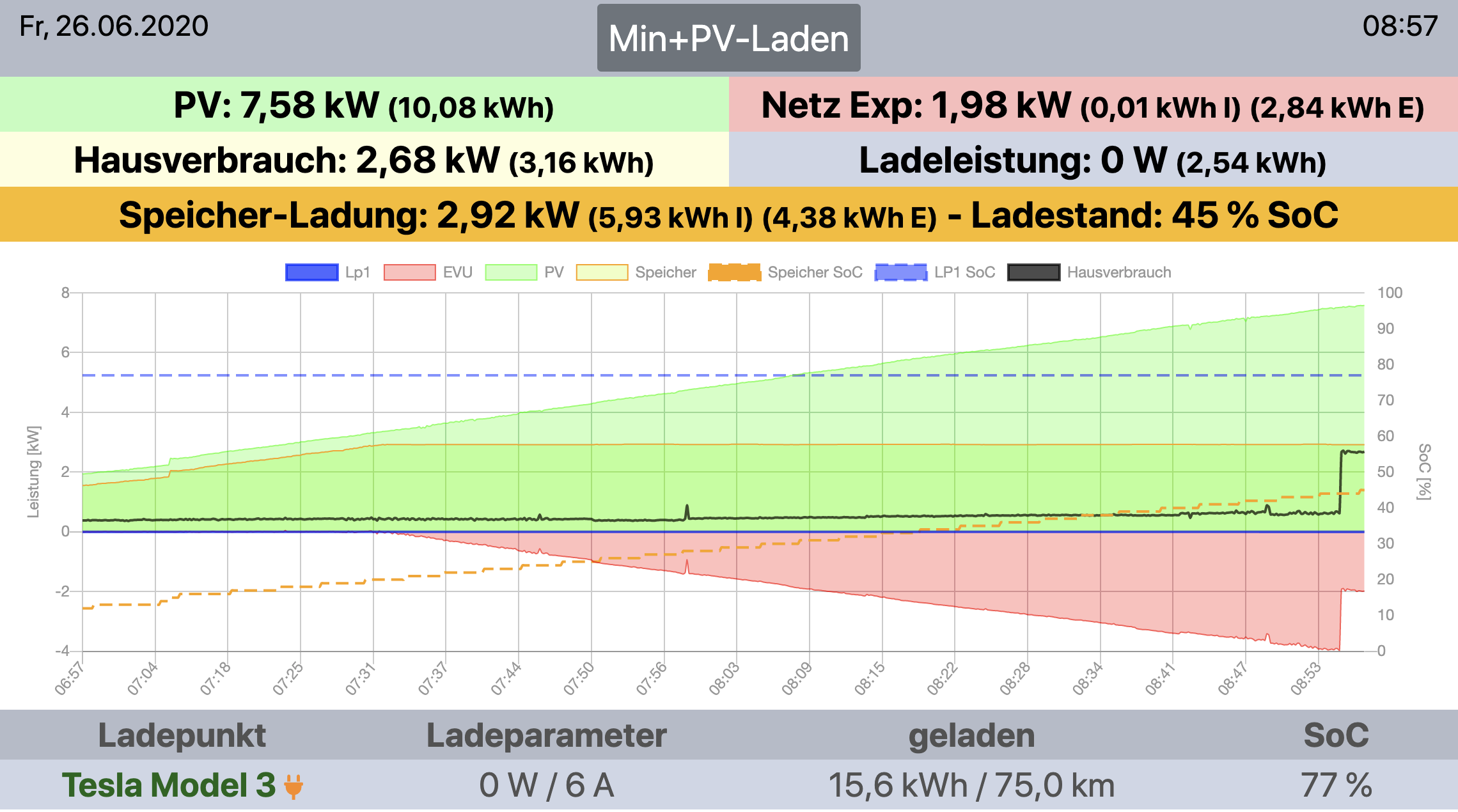 Irgendwann hört das dann auch mit steigender PV-Leistung auf, geht dann aber weiter, wenn min. SoC vom Speicher (15 %) erreicht ist.