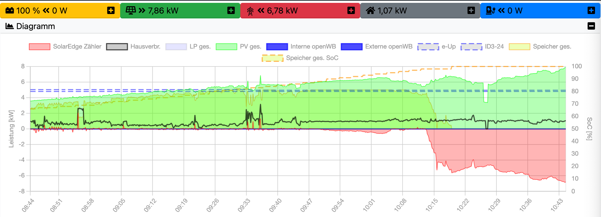 Es ist so, wie du vermutet hast. Wenn der Speicher lädt, wird im Diagramm des Standard-Themes die korrekte PV-Leistung angezeigt. Die Werte im Status passen entsprechend ebenfalls.