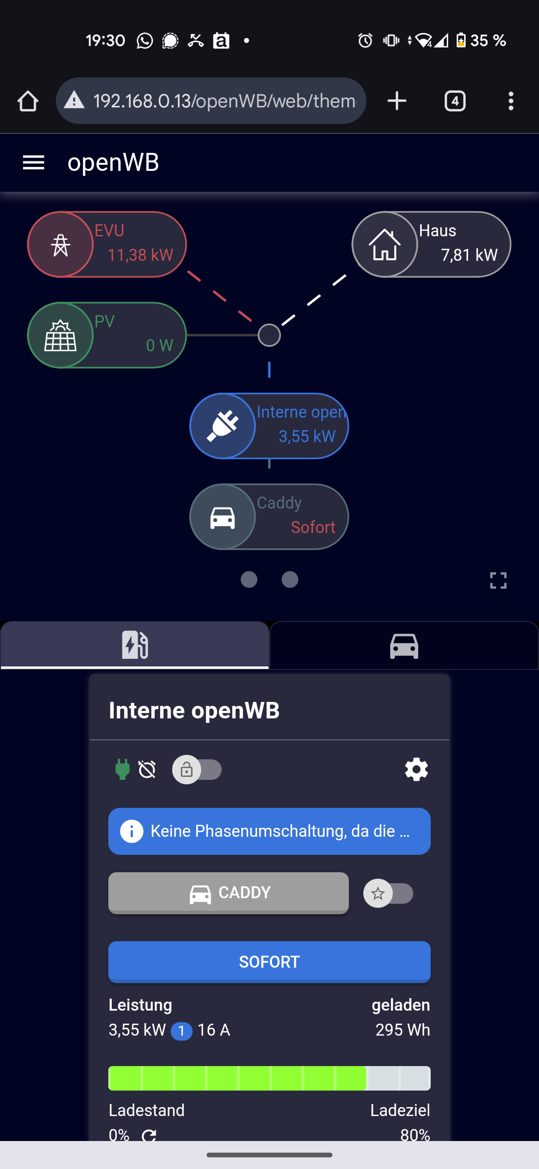 ich habe dann gestern die Box über USB-Stromversorgung und LAN-Kabel angeschlossen und vorkonfiguriert. Der Elektriker war heute da und hat alles angeschlossen. Grundsätzlich lädt sie, aber irgendetwas passt noch nicht: Wenn sie 3-phasig lädt, dann zeigt sie trotzdem nur 1-phasige Ladung an. Ein Drittel der Ladeleistung wird dann am Ladepunkt angezeigt, die anderen 2/3 am Hausverbrauch. Sie versucht dann auch noch, zwischen 1-phasiger und 3 phasiger Ladung umzuschalten und gibt irgendwann auf. D.h. grundsätzlich funktioniert sowohl 1-phasige als auch 3-phasige Ladung aber aus irgendeinem Grund wird die 3-phasige Ladung nicht korrekt dem Ladepunkt zugeordnet. Das ist sowohl der Fall, wenn ich die WB als primary konfiguriere als auch wenn ich sie als secondary konfiguriere.