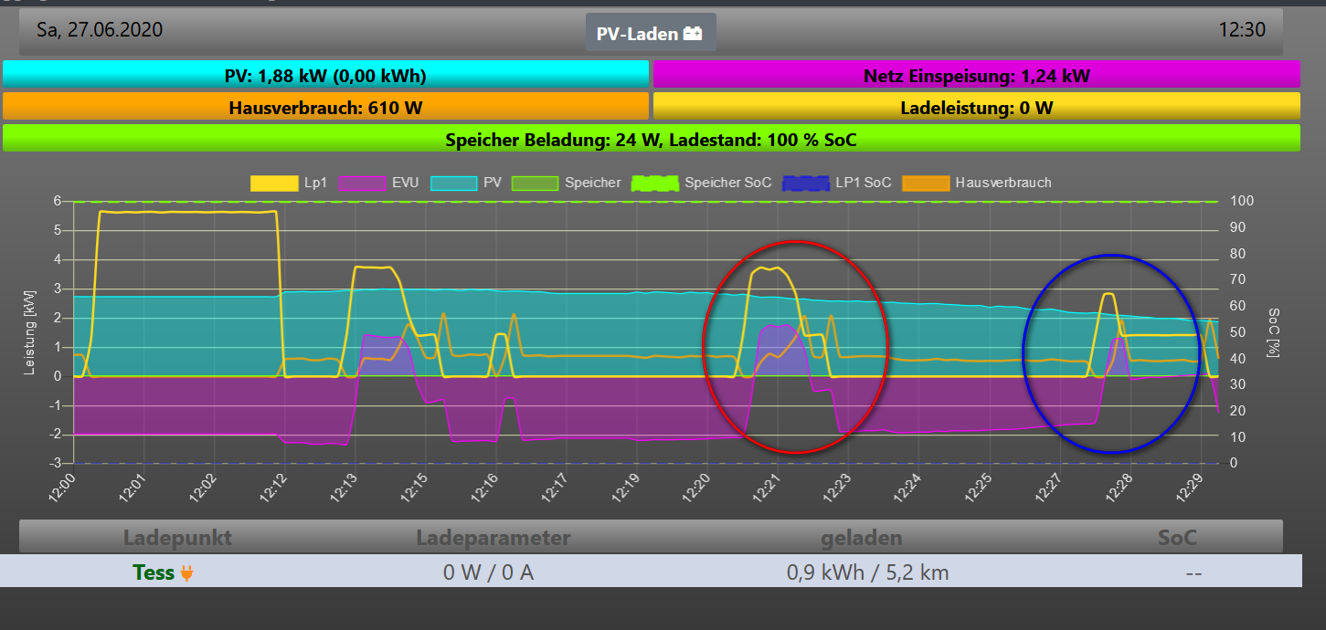 Ich hab die EVU Glättung komplett ausgeschaltet, damit ist es ein wenig besser geworden (Bild blauer Kreis) im vergleich zu mit Glättung (roter kreis). Trotzdem hab ich das Gefühl das hier einfach viel zu schnell hochgeregelt wird, oder die Daten nicht schnell genug verarbeitet werden die ich schicke...