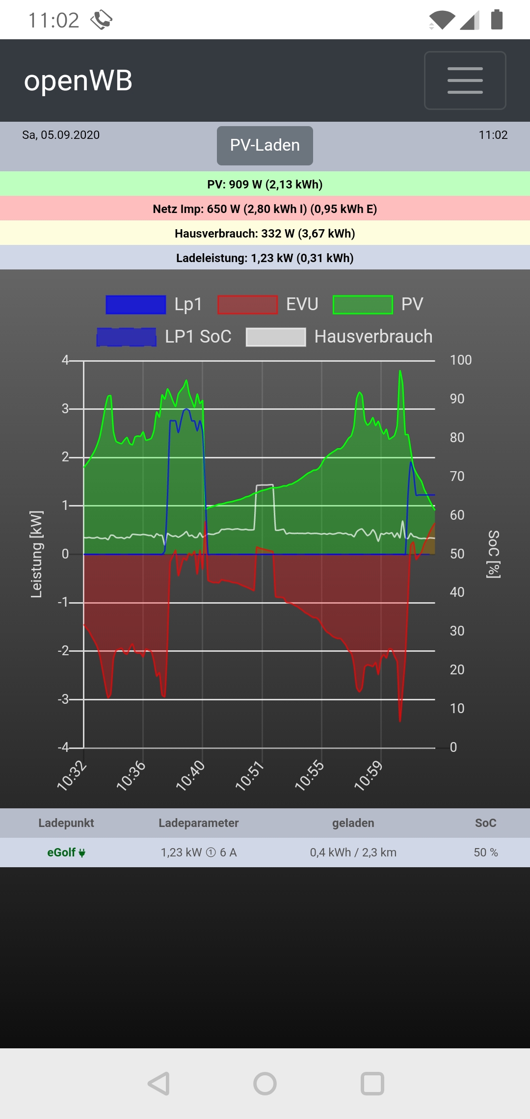 Wie oft kommt es bei dir vor? Anstecken ohne Ladefreigabe, erster Ladestart am Folgetag?eGolfer hat geschrieben: So Aug 30, 2020 10:00 pmKrailPV hat geschrieben: Di Aug 18, 2020 4:18 pm Was ich in letzter Zeit als problematisch beobachten konnte: neben dem oben beschriebenen häufigen Umschalten, ist es wohl auch problematisch, wenn der egolf angehängt wird, wenn gerade keine Sonne scheint und somit nicht geladen wird. Wenn dann zu einem späteren Zeitpunkt geladen werden soll wacht diese einfach nicht auf.Ich kann das nicht bestätigen. Mit den verlängerten Schaltzeiten kam es bei mir nicht mehr zu häufigen Unterbrechungen. Welche Zeiten im Einzelfall gut passen, liegt sicherlich auch an der Größe / Leistung der PV. Und auch laden im "Nur-PV-Modus" über mehrer Tage hinweg funktioniert bei mir bisher fehlerfrei.openWBSupport hat geschrieben: Di Aug 18, 2020 5:39 pm Das würde bedeuten das VW die Software verschlimmbessert hat.
