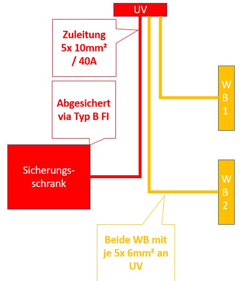 Beide Wallboxen werde ich an die Unterverteilung hängen, die aktuell (vermutlich) nur mit 5x 2,5mm² Zuleitung angeschlossen ist und via 3x 16A Sicherungen und 40A / 0,03A FI abgesichert ist.
