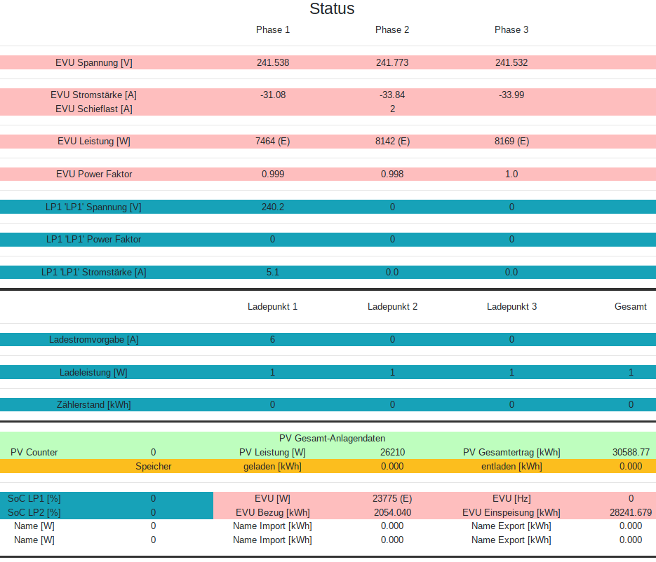 Ich habe ein ähnlich, eventuell das gleiche Problem. Im Anhang Screenshots von der Startseite und der Statusseite. Die OpenWB habe ich gerade erst heute morgen angeschlossen, insofern ist natürlich eine Konfigurationsproblem erstmal denkbar, wenn ich aber nicht der einzige bin steckt vielleicht auch was anderes hinter...