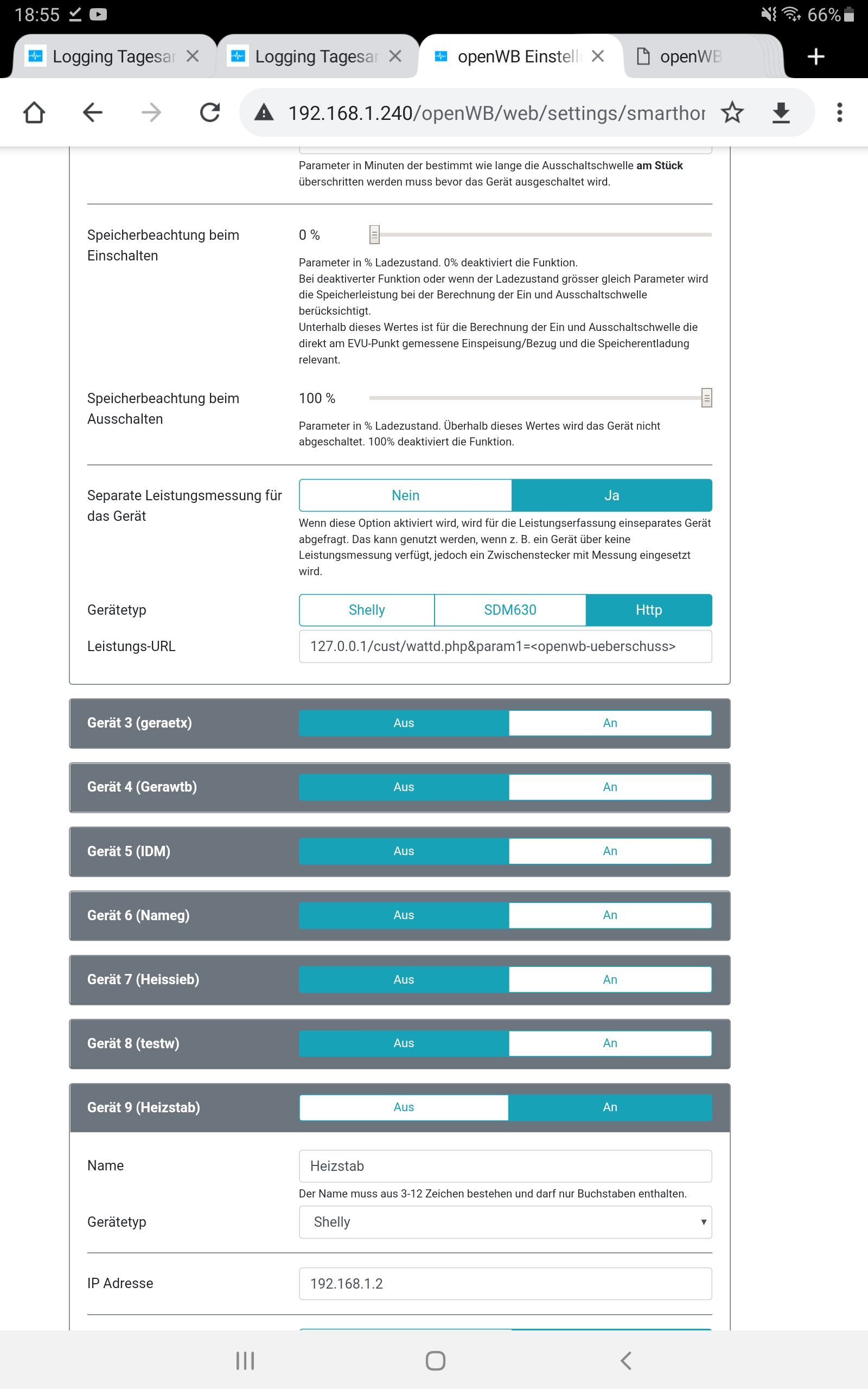 Jetzt nur noch in den Einstellungen der openWB unter SmartHome2.0 ein Gerät mit den entsprechenden Einstellungen (siehe Anhang) anlegen.