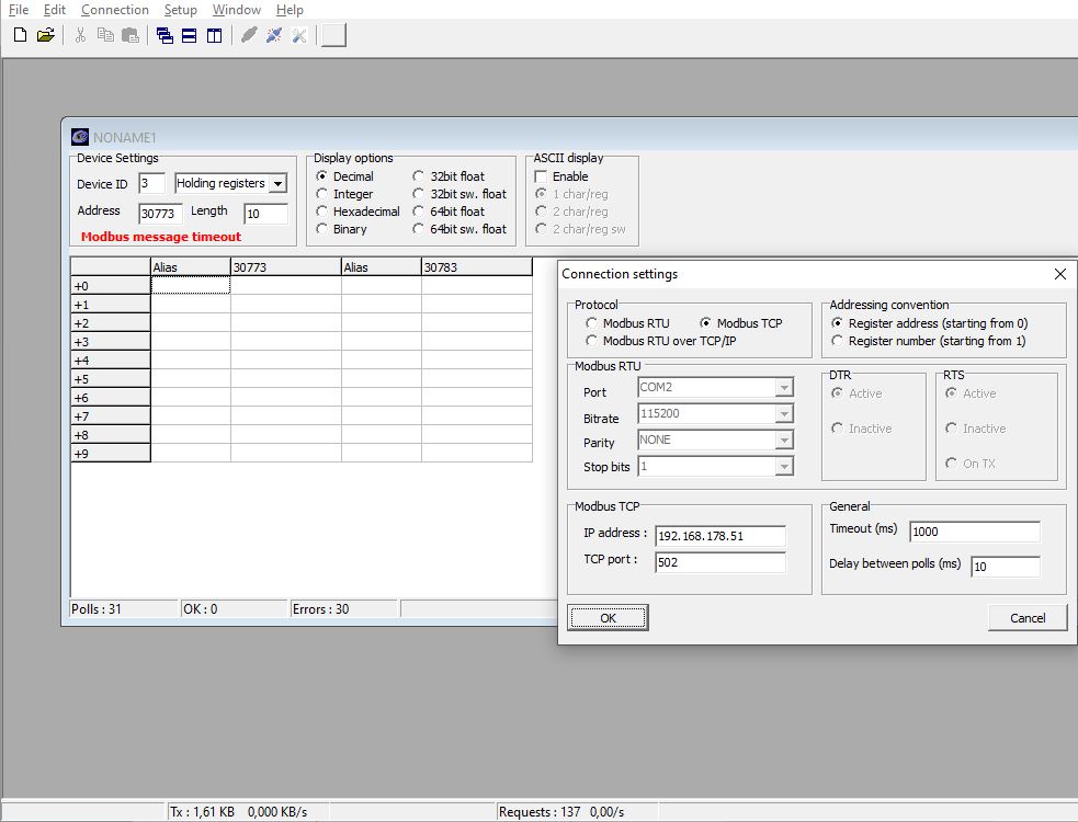 Habe den Modbus Simulator versucht. Es scheint keine Antwort vom WR zu kommen. Siehe Screenshot