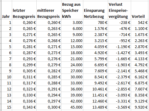Einsparung Netzbezug ausserhalb der PV-Zeiten Brutto 3000 * 0,26€ = 780€ im ersten Jahr