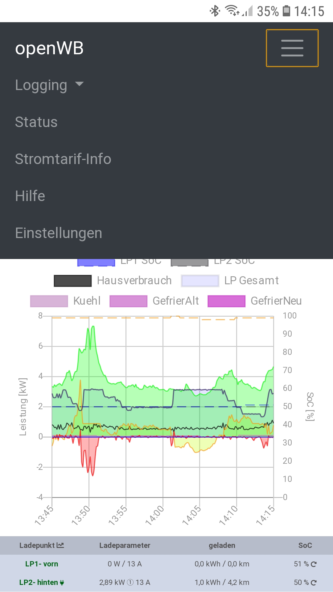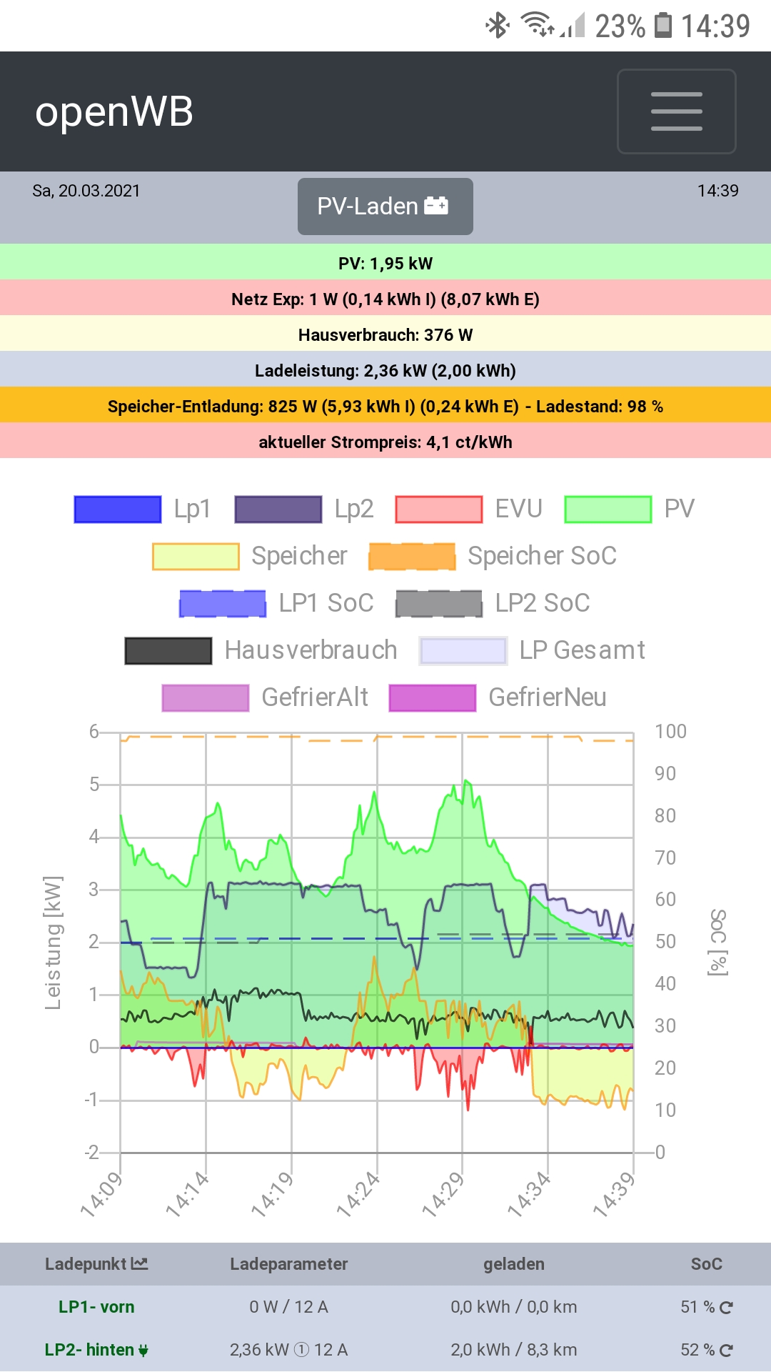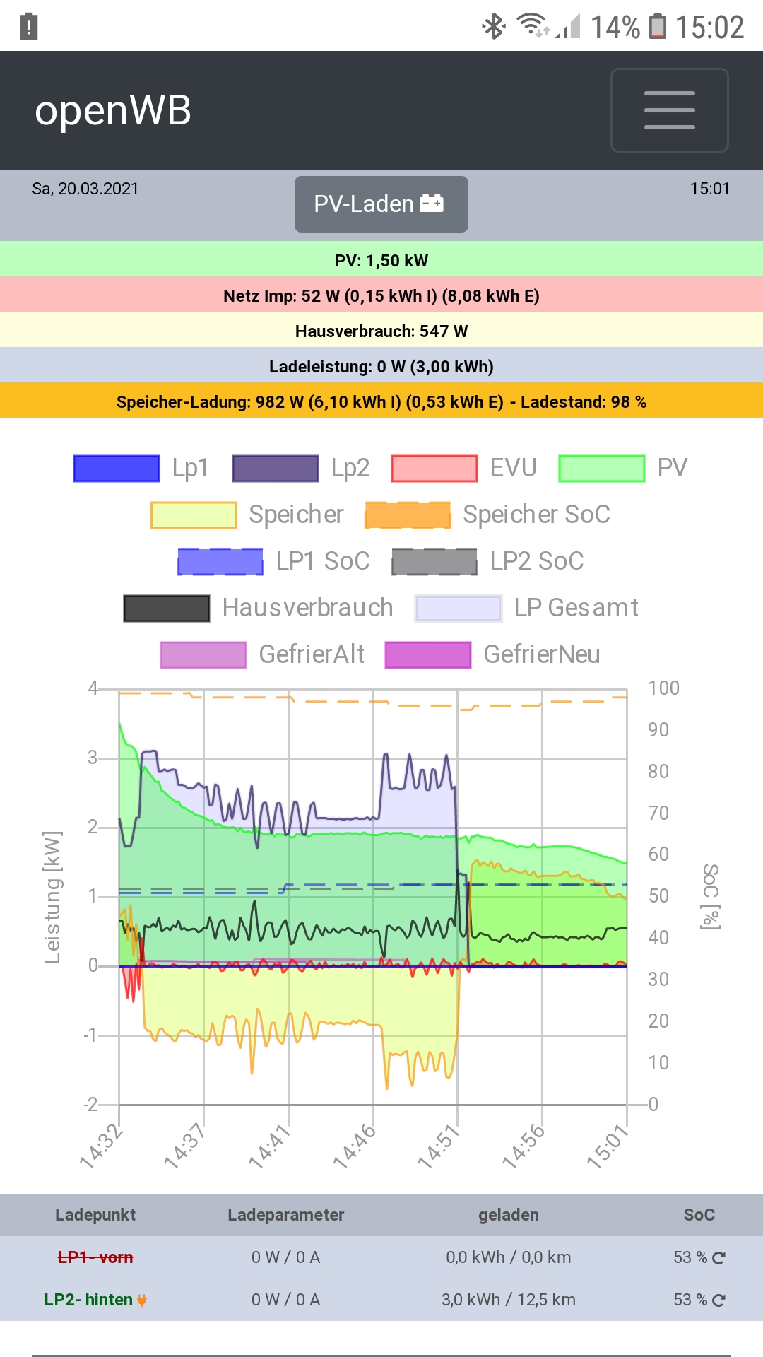 Um 14.46 Entladeleistung des Hausspeichers auf 1500W erhöht, bei genau 95% SoC Hausspeicher wurde Ladung wie gewollt beendet.