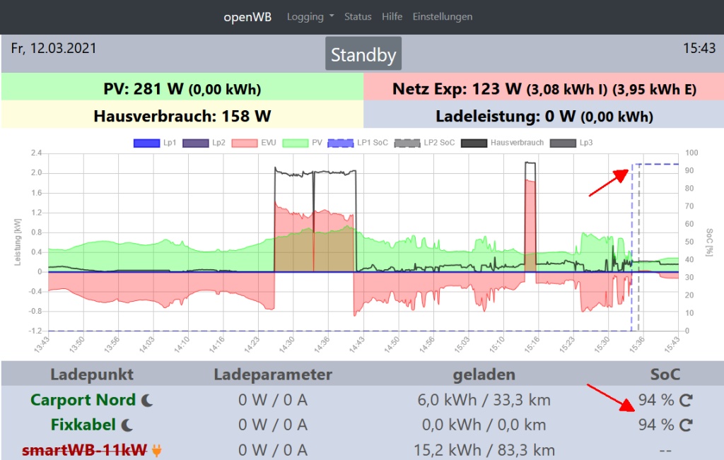 10kWp PV mit SMA Tripower 10000TL-10 (PE11 mit SDM72V2); 2,4kWp mit Solis 2.5 G6 (EE11 mit SDM120). OpenWB Standard+. EVU EM540 an einem Raspi mit Venus OS. BEV Mercedes EQA 250+ (07/2025)
