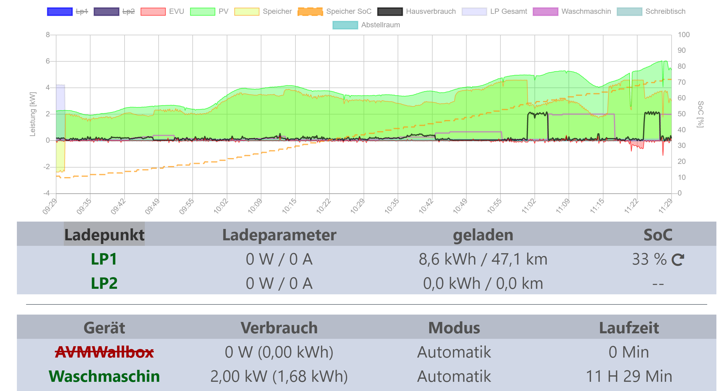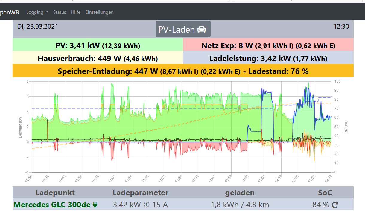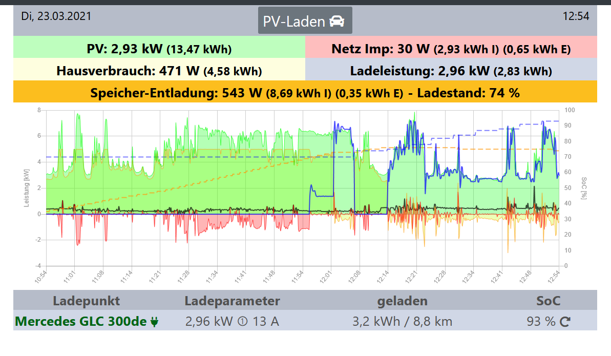 Hier noch mal ein aktueller Screenshot, wo man klarer erkennen kann, dass trotz Überschuss der Speicher entladen wird.