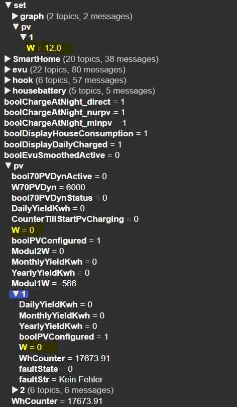 Aktuell habe ich wieder nur 12W PV und diese sind zwar wieder im set topic, werden wieder nicht von der openwb übernommen.