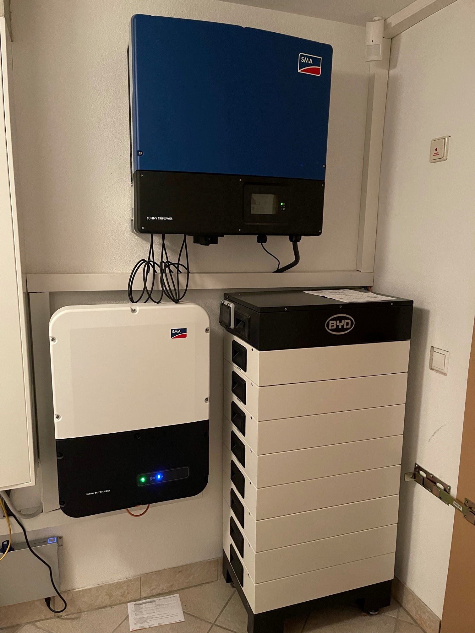 Links der "alte" SMA nur für PV, rechts der plenticore für PV + 2x BYD- HV, DC- gekoppelt über Y- Yerteiler (mittig kleiner Kasten) für beide BYD.