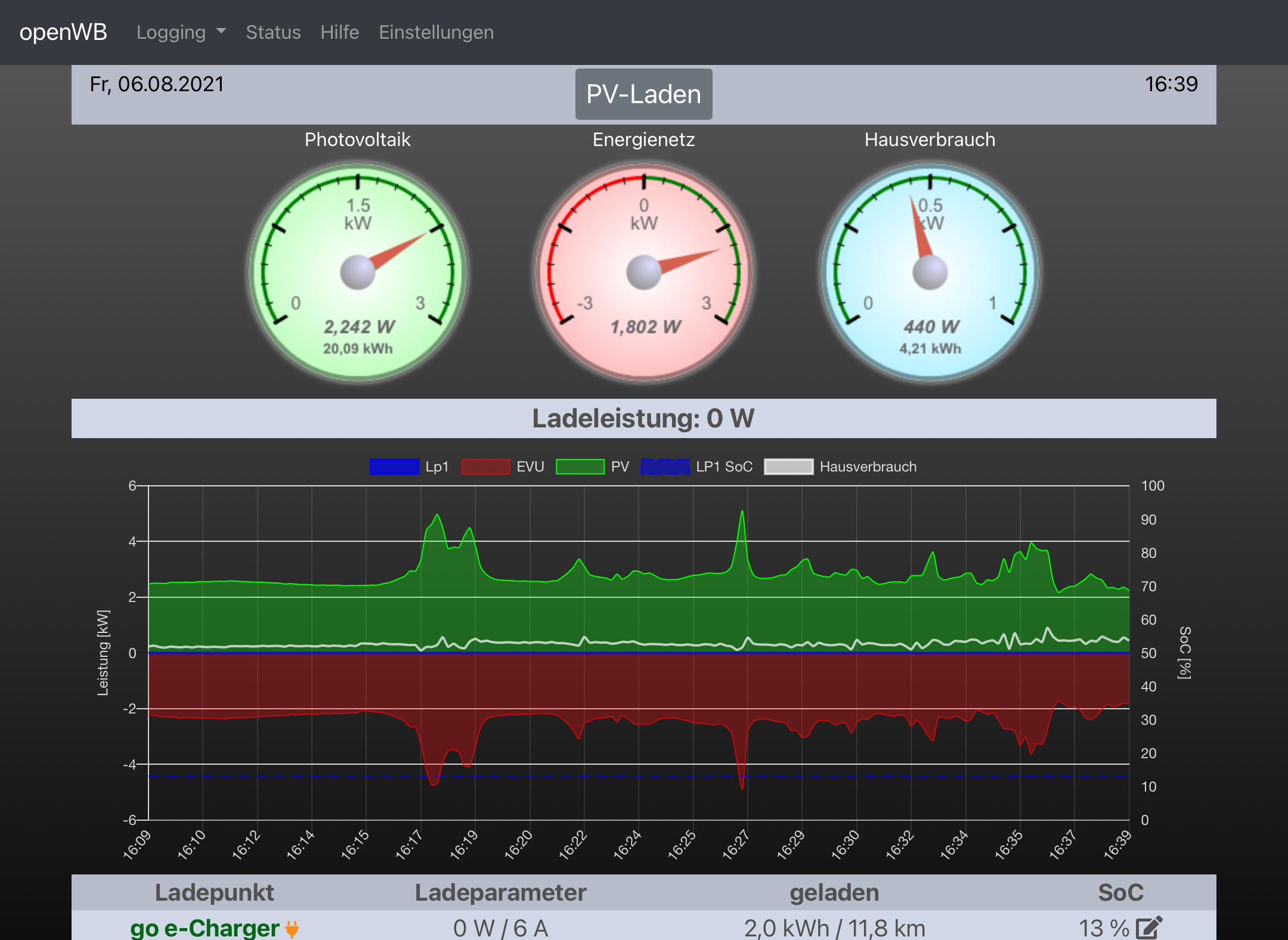Im Go-e Charger ist der Ladestrom ebenfalls auf 6A. Der wird anscheinend von den openWB gesteuert. Stell ich den Wert im Go-e händisch auf 16A geht die Ladeleistung auf ca. 3,5kW, aber dann permanent. Da kann die openWB nichts mehr regeln.