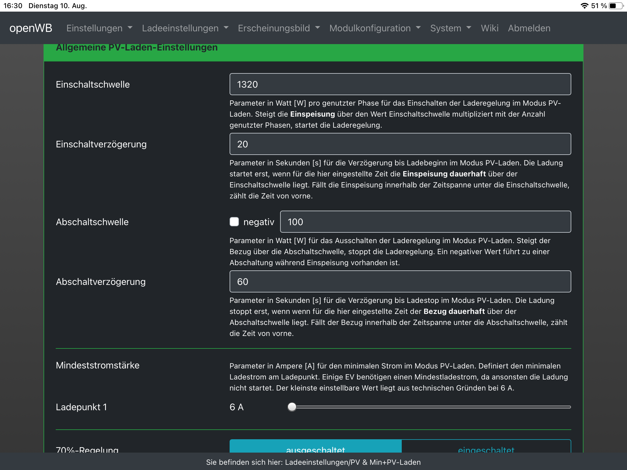 Wenn Du mit der PV so im Grenzbereich (Haus + 1300 W Auto) bist, ist es meist besser, auf Min.+ PV zu stellen.