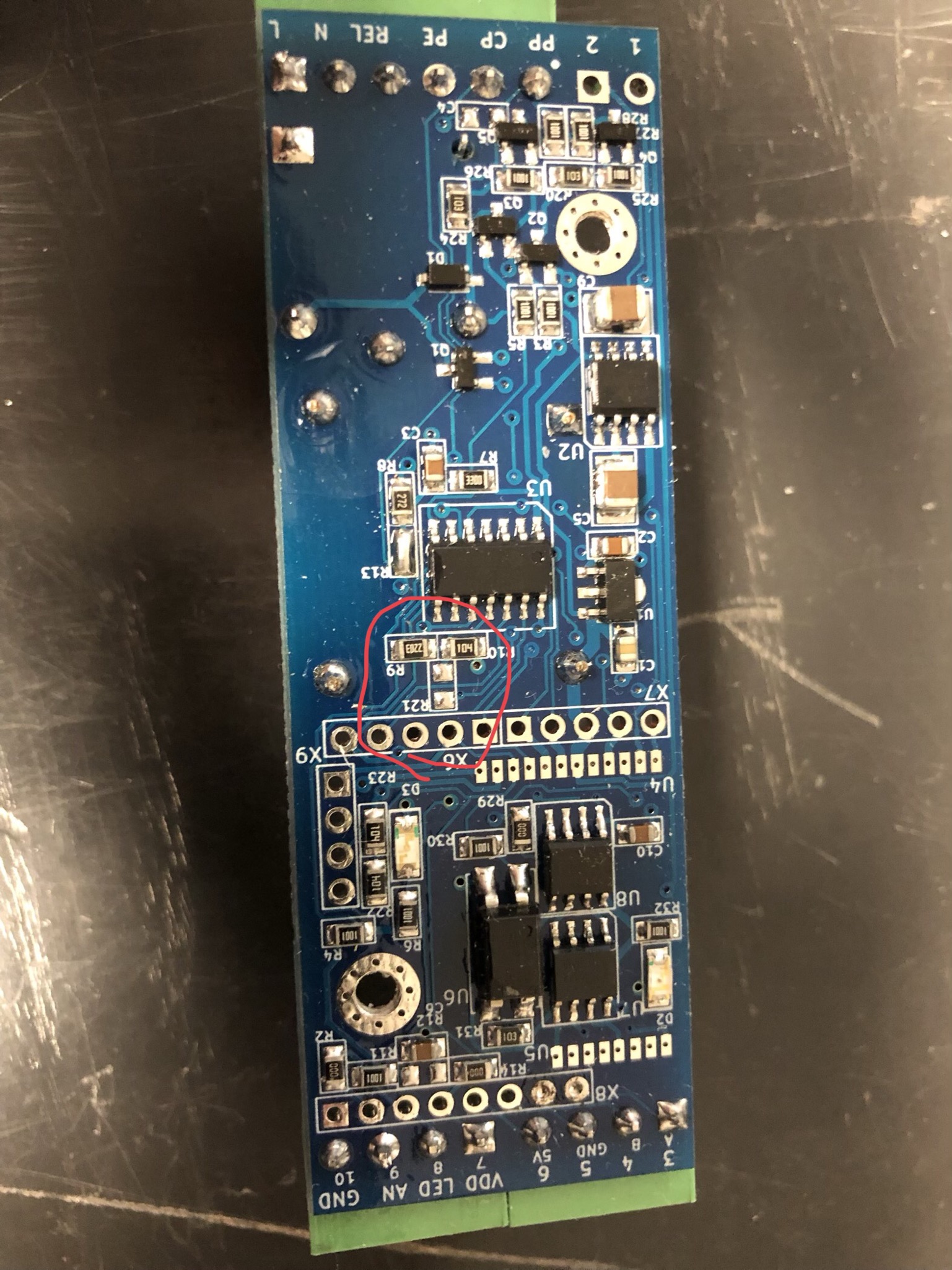 Auf der PCB-Rückseite der EVSE DIN ist der Platzhalter auch mit R21 bezeichnet. Er sitzt neben einem IC. Den findet man gut. Dort habe ich einen 100k Widerstand der SMD-Baugröße 0805 bestückt.