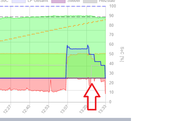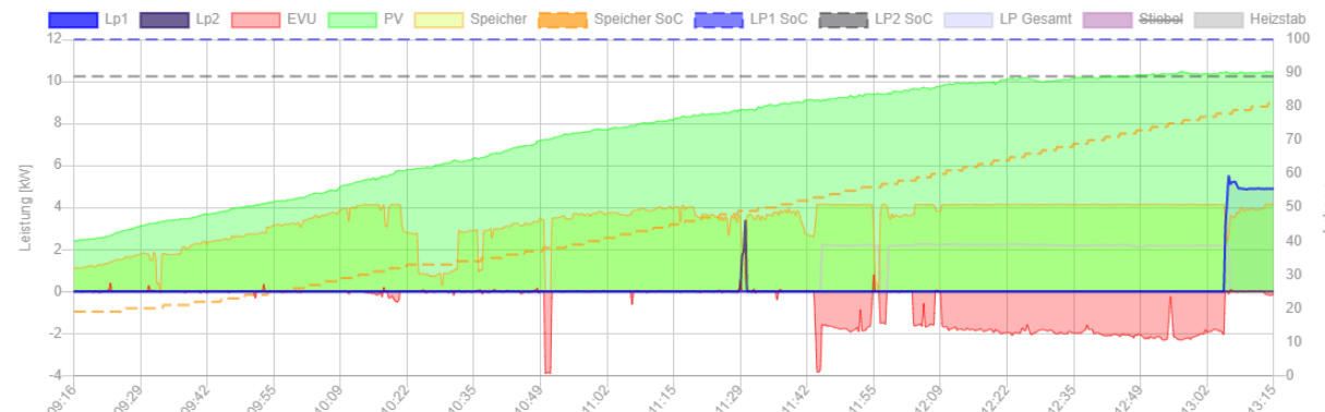 Cirka um 13:22 ist nun genug Überschuss da um den Heizstab wieder zu starten. Und die Ladung läuft noch.