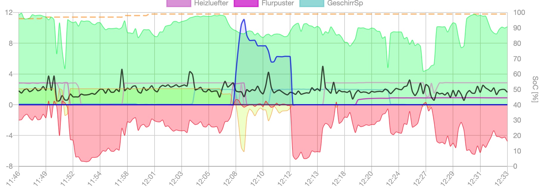 Dann habe ich um 12:08 das Auto eingesteckt und die Devices gingen aus und später nach Ladeende wieder an. Dass da welche während des Autoladens wieder anspringen würden, gibt der Überschuss gerade nicht her. Ich muss auch erst mal wieder was fahren, damit in die Batterie wieder was reinpasst. Dann setz' ich auch mal den max. Ladestrom im Tesla nach unten, damit die anderen da eine Chance haben.