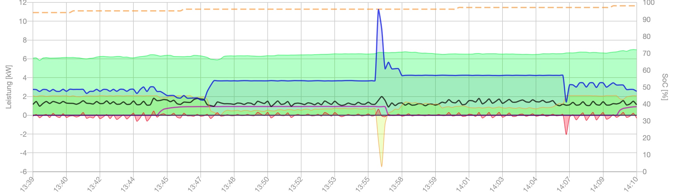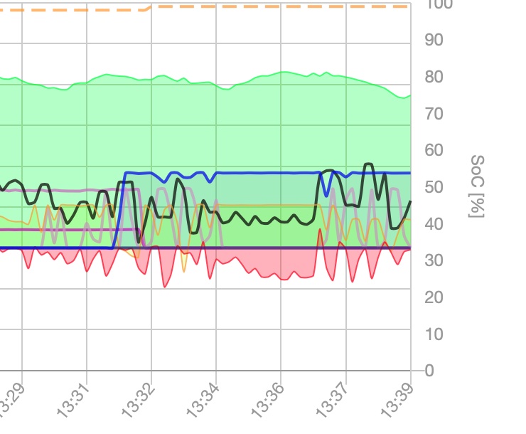 Nun hier mal ein update mit reduzierter Ladeleistung und einem dazugeschaltetem Verbraucher. Das ist der Heizstab, der dem Überschuss ein bissl hinterherhinkt. Wie man sieht, bleibt der aber an und versucht den Überschuss zu verbrauchen.