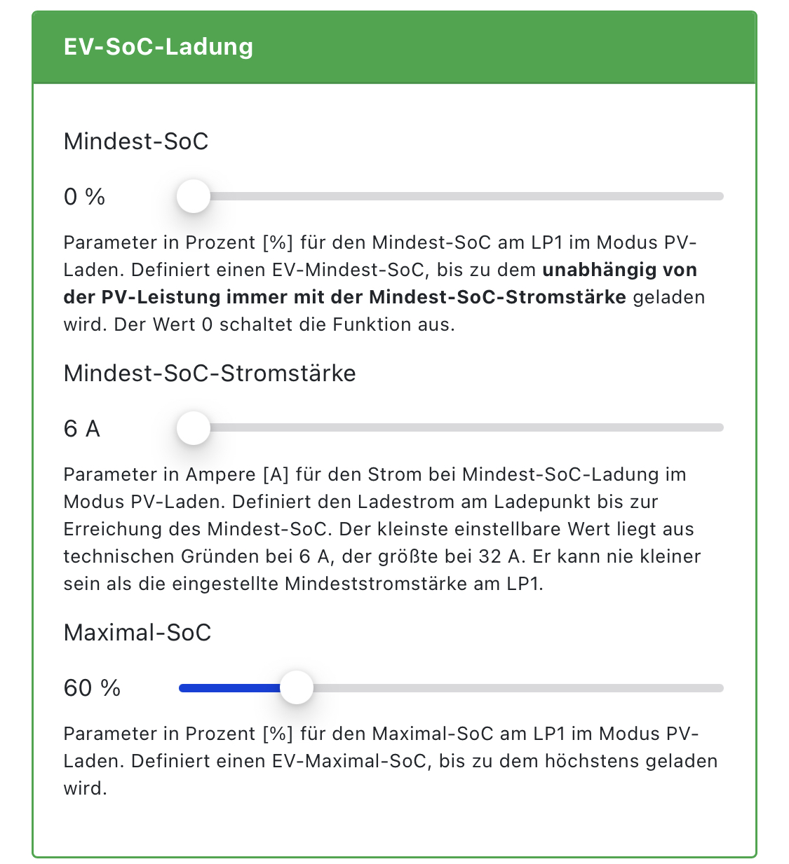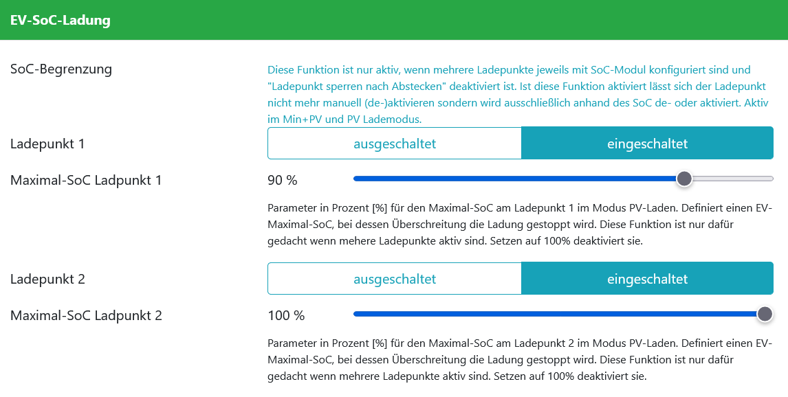 Bei mir gibt es diese Auswahl nicht, da ich 2 LP habe. Hier gibt es keinen Mindest- SoC, nur 2x Max- SoC- Auswahl möglich... VG