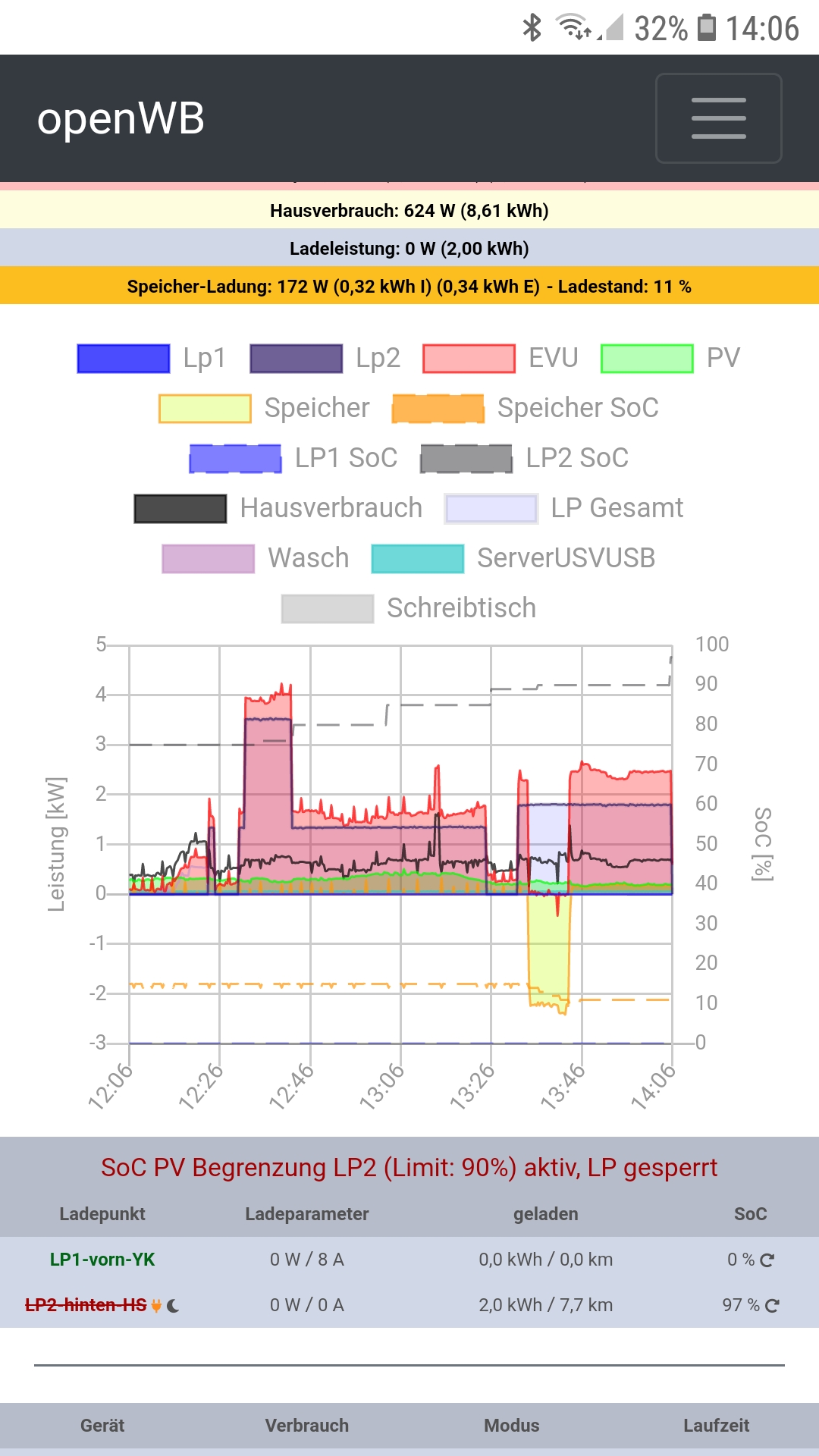 Selbstverständlich wird abgeschaltet bei Überschreitung meiner eingestellten 90%- max- SoC. Hier etwas später, da Abfrageintervall 10 Min. dann nach SoC- Aktualisierung bei 97%. Wie Du siehst, taucht auch die Warn-/ Infomeldung im Screen auf und LP 2 wird deaktiviert.