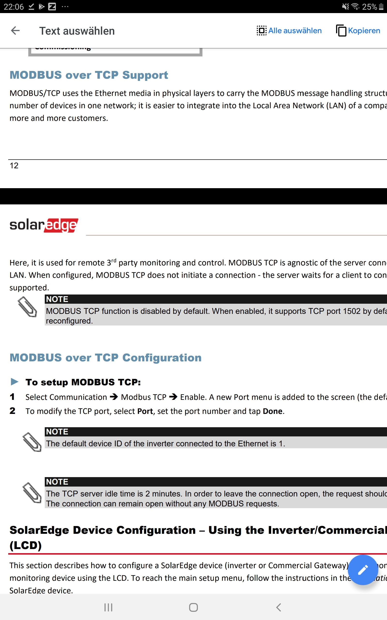 Aber einfach den ModbusTCP Server einschalten wenn vorher schon openWB konfiguriert ist, dann kann sich openWB direkt nach einschalten des Servers an den WR verbinden.
