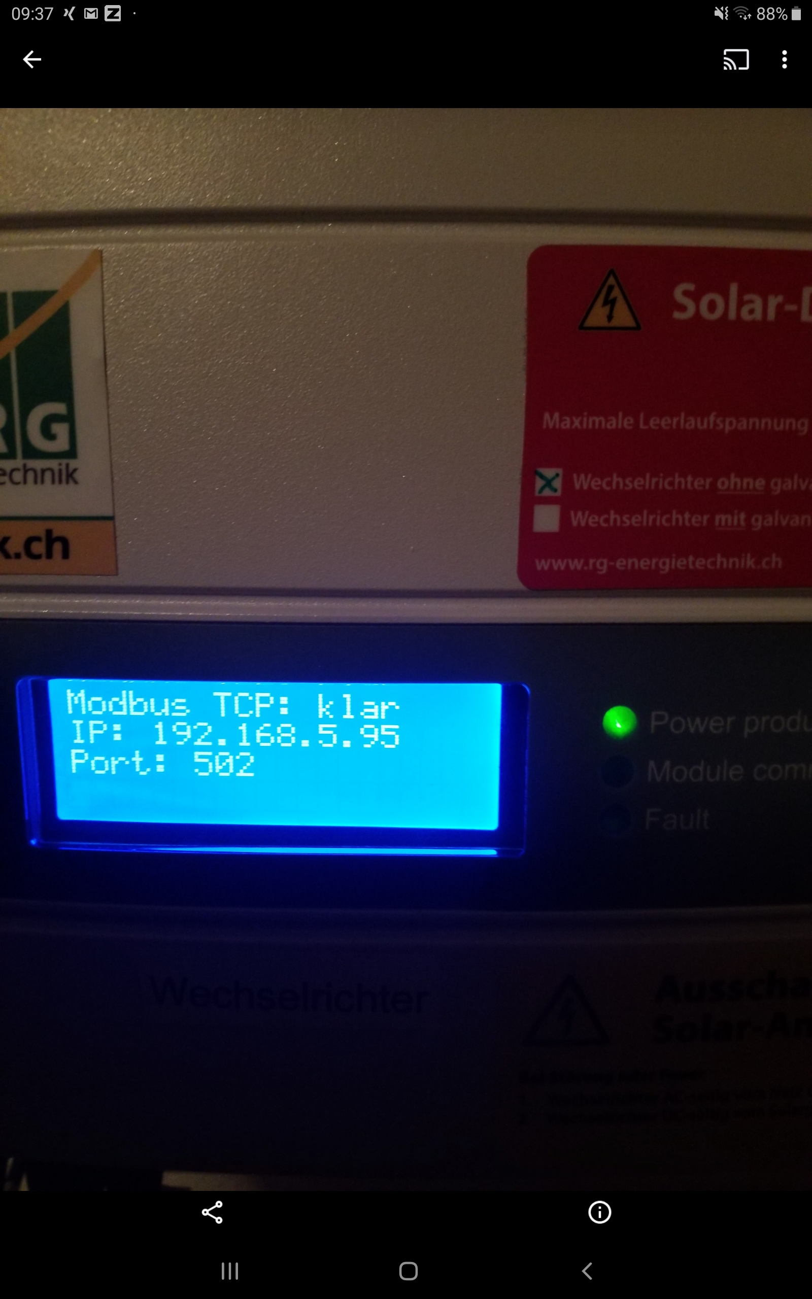 Richtig so einen hab ich auch. Wenn modbus eingeschaltet ist, muss in den ersten zwei minuten nach start ein zugriff auf die Schnittstelle erfolgen. Sonst macht der Wr die zu.