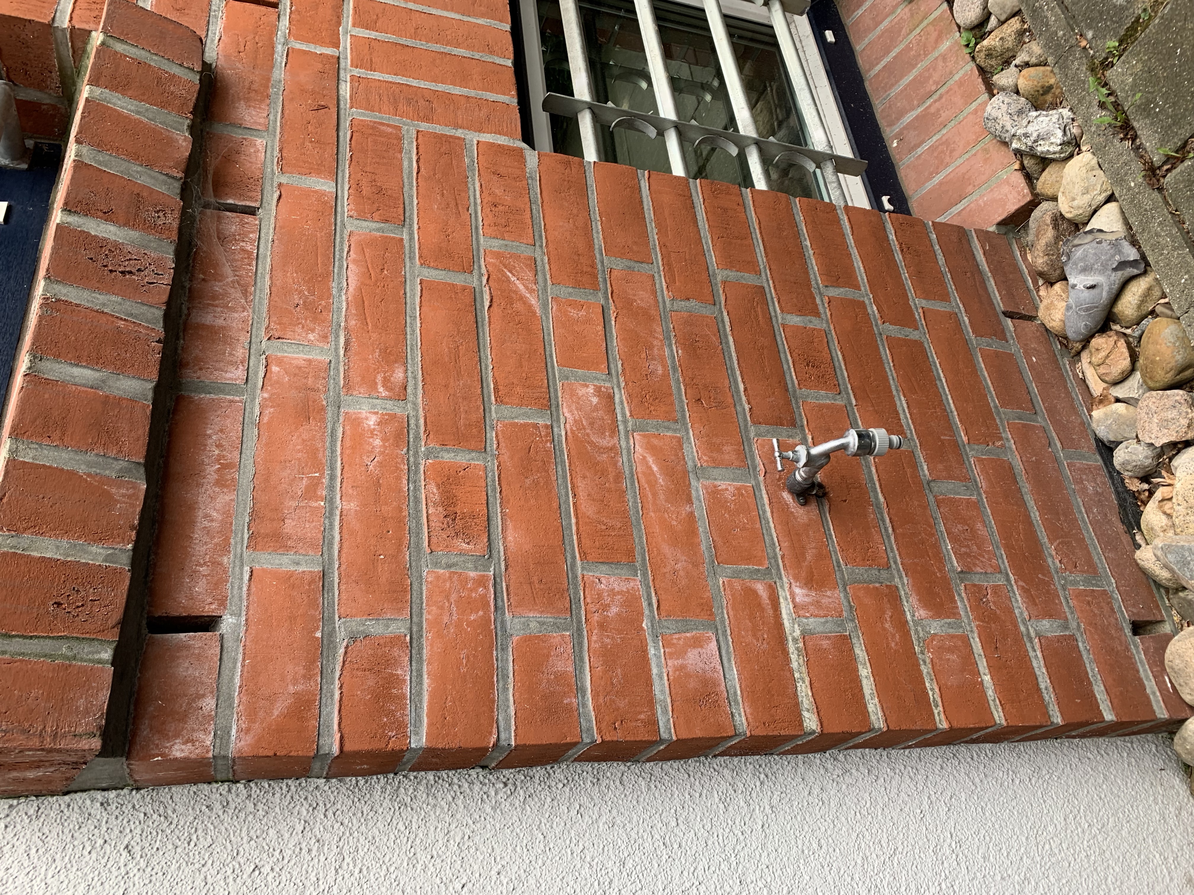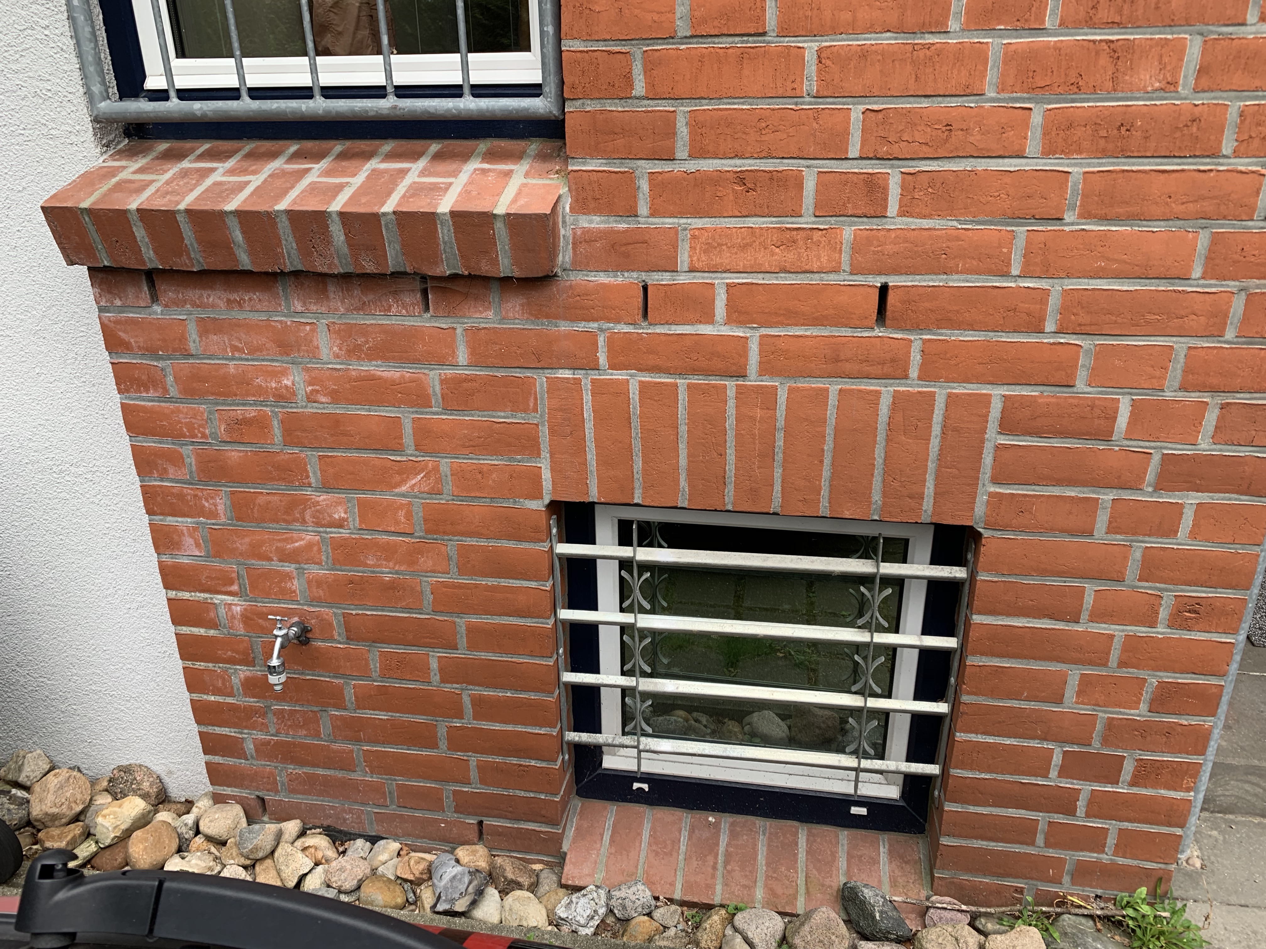 Das Auto parkt direkt vor dieser roten Backsteinmauer... rechts der überdachte Eingang. Dort ist wenig Platz und ein Kabel müsste um die scharfkantige Mauer gezogen werden. Links über Kellerfenster optimaler Montageort.