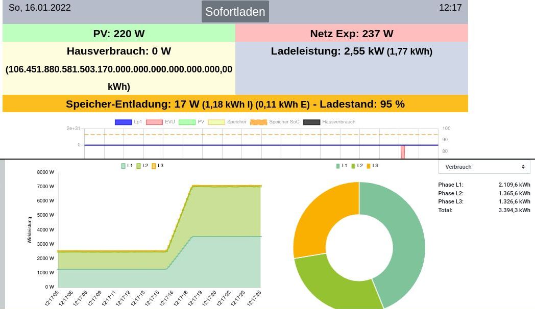 2022-01-15 19:00:09: LP1, Lademodus Sofort. Ladung geändert auf 16 Ampere, Lastmanagement aktiv (LV0)