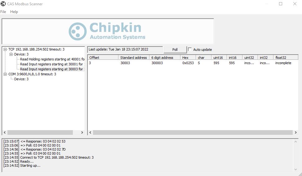 2022-01-18 00:47:30: PID: 13968: pymodbus.client.sync: Connection to Modbus server established. Socket ('192.168.188.80', 36463)