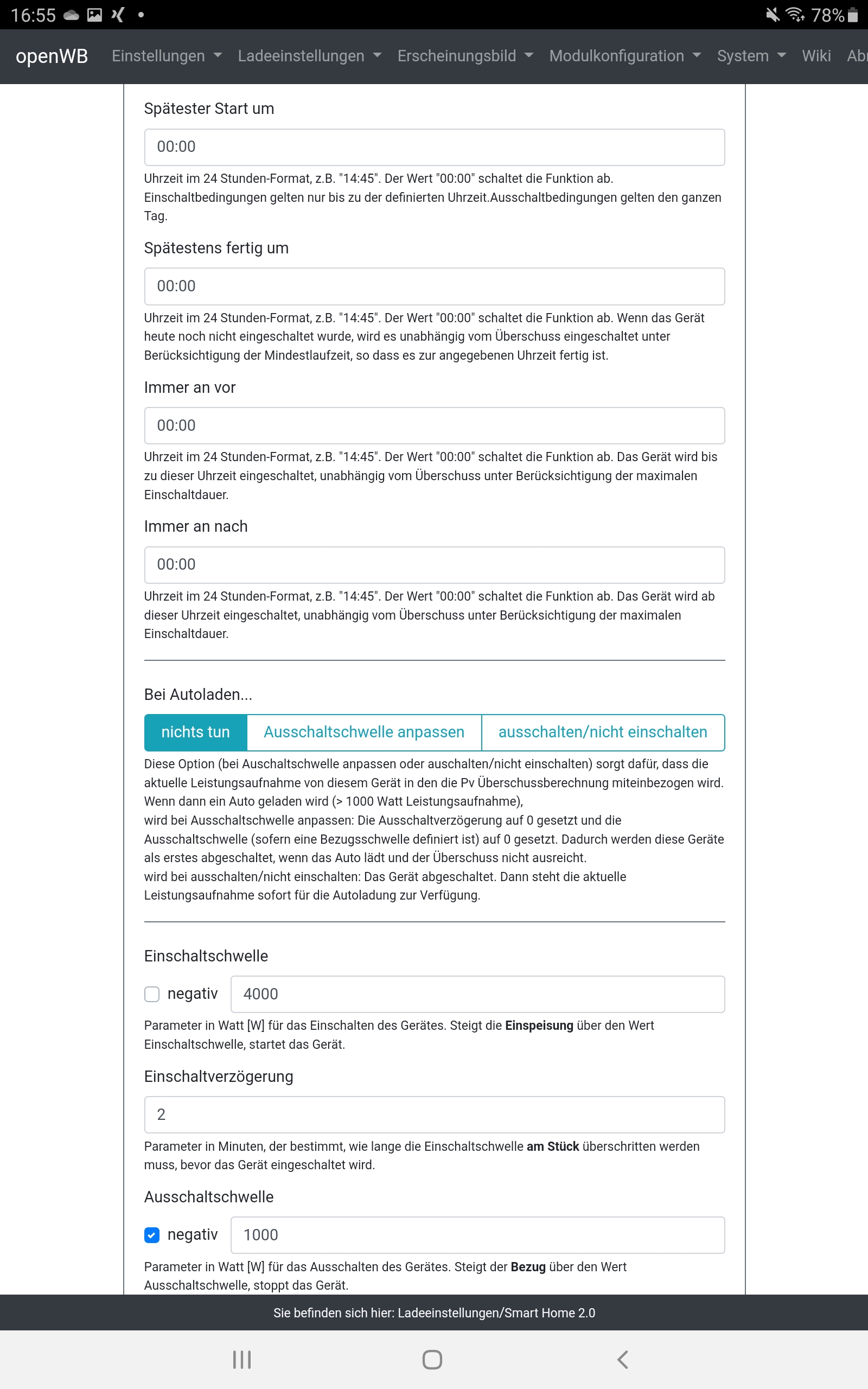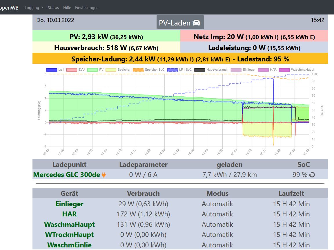 Und dann noch zum „Aus der Überschussrechnung“ rausnehmen: Ganz so einfach ist es dann doch nicht. Denn der vom Smarthome erkannte Überschuss kommt direkt vom EVU-Punkt. Der Verbrauch Deines Heizstabs ist ja schon im Hausverbrauch drin. Du kannst ihn allenfalls separat ausweisen. Wenn Du ihn bei der Überschussbetrachtung der openWB zum Überschuss dazurechnest würde ggf. ein anderer Verbraucher eingeschaltet und damit mehr Strom verbraucht als da ist. Jetzt kommt es darauf an, wer beim nächsten Zyklus schneller ist: Der Heizstab, der erkennt, dass er runterregeln muss oder die openWB, die dann ggf die Ladeleistung eines Autos runterregelt. Das Smarthome knipst ja nur an und aus. Regeln tut die Autoladerei. Wenn‘s doof läuft, geht der Überschuss in den Heizstab statt ins Auto.