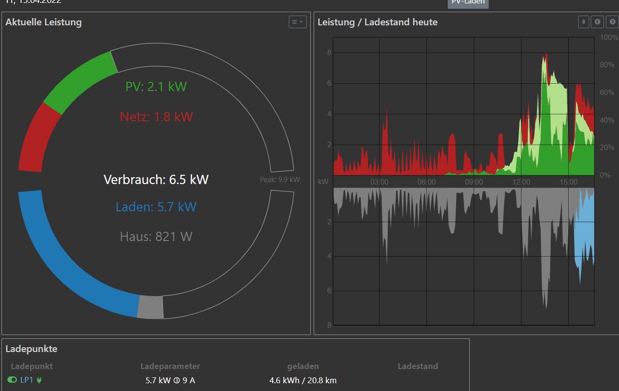 Im Graph 2 sieht man das er wieder sofort mit 5,7kw 9A lädt obwohl soviel PV Strom gar nicht mehr da ist. die kleine eingekreiste 3 unten beim Ladepunkt bedeutet das er mit 3 Phasen lädt?
