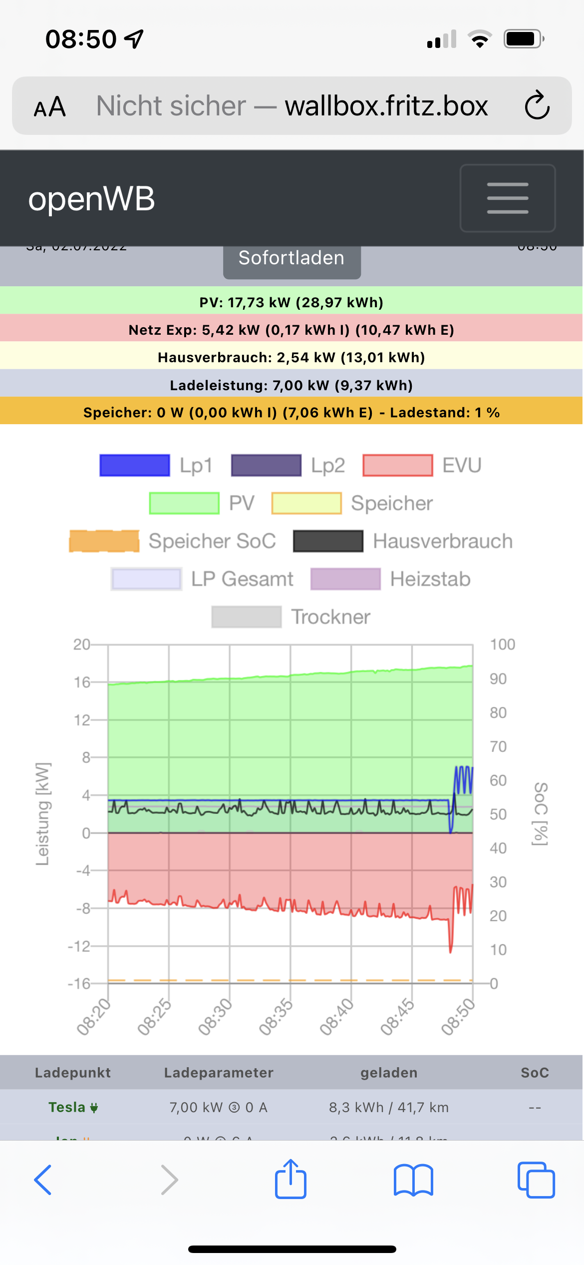 1. Anstecken mit PV-Laden: Laden startet mit einer Phase und bleibt auch bei einer Phase, egal wieviel die PV Leistet. Wechsel auf Sofort-Laden (3P) bleibt bei einer Phase. Ladepunkt bleibt bis zum Morgen aktiv.