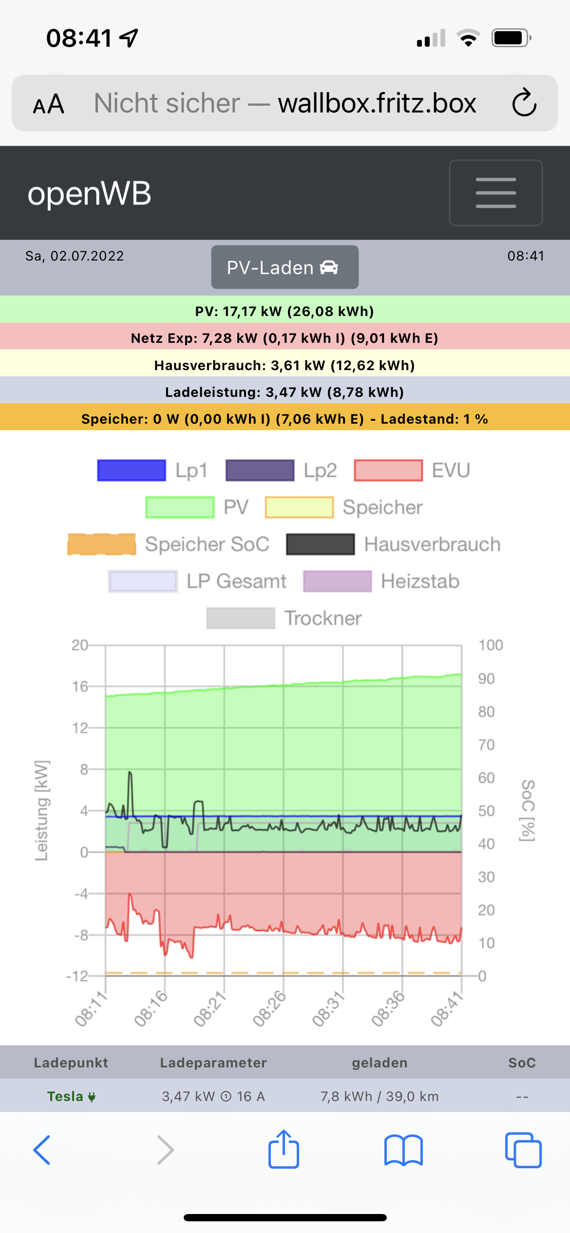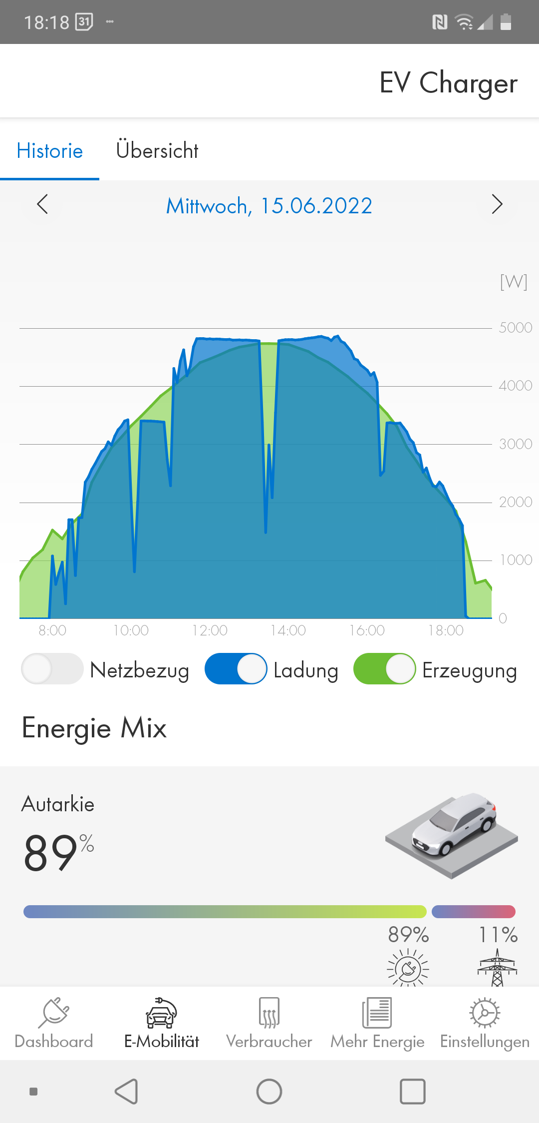 Morgens unterbricht die Wallbox öfters, weil ich damals noch zu wenig Netzanteil freigeben hatte. Gegen 11 Uhr ist dann 1phasig ausgereizt, nachdem der Überschuss die 4kW überschreitet schaltet die Wallbox auf 3phasig. Gegen 13:30 Uhr gabs wahrscheinlich Mittagessen, anschließend wurde wieder mit 3 Phasen weitergeladen. Das Auto macht keinerlei Probleme.