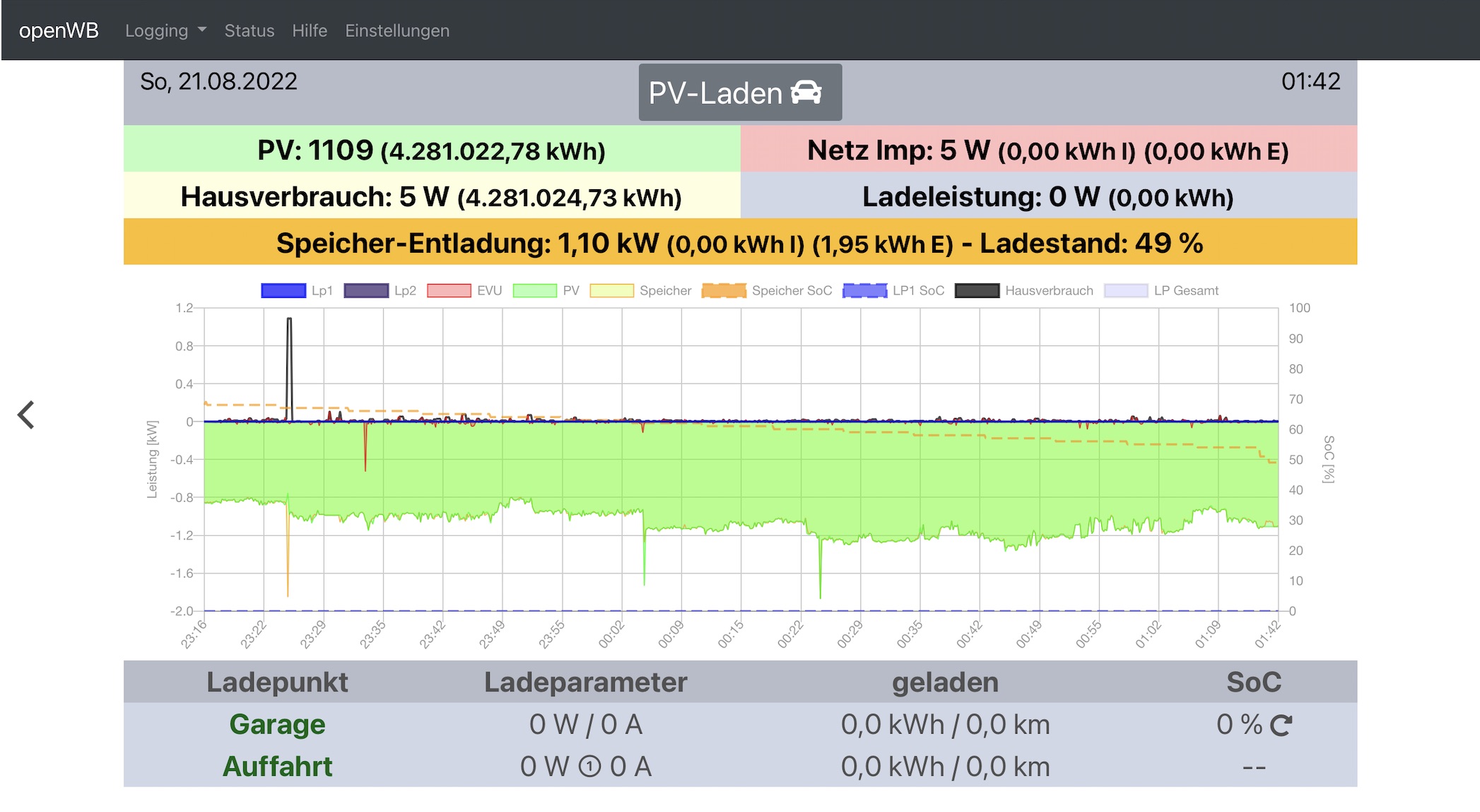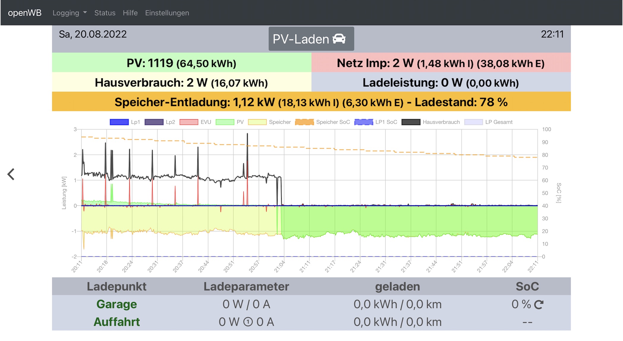 - Die Anzeige wechselt von Batterieentladen auf PV-Erzeugung, ich vermute genau dann, wenn auch der letzte Wechselrichter bei Sonnenuntergang die PV-Erzeugung einstellt