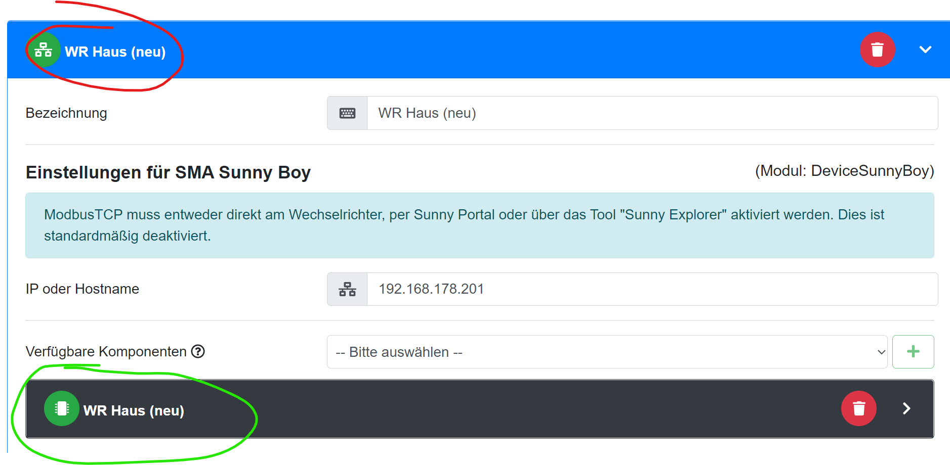 Hat bei mir schon eine Weile gebraucht bis ich verstanden hatte dass ich für meinen schnöden SMA Wechselrichter zuerst das Gerät und dann die Komponente erzeugen muss. Wäre schön wenn man diese Lernkurve für andere abkürzen kann.