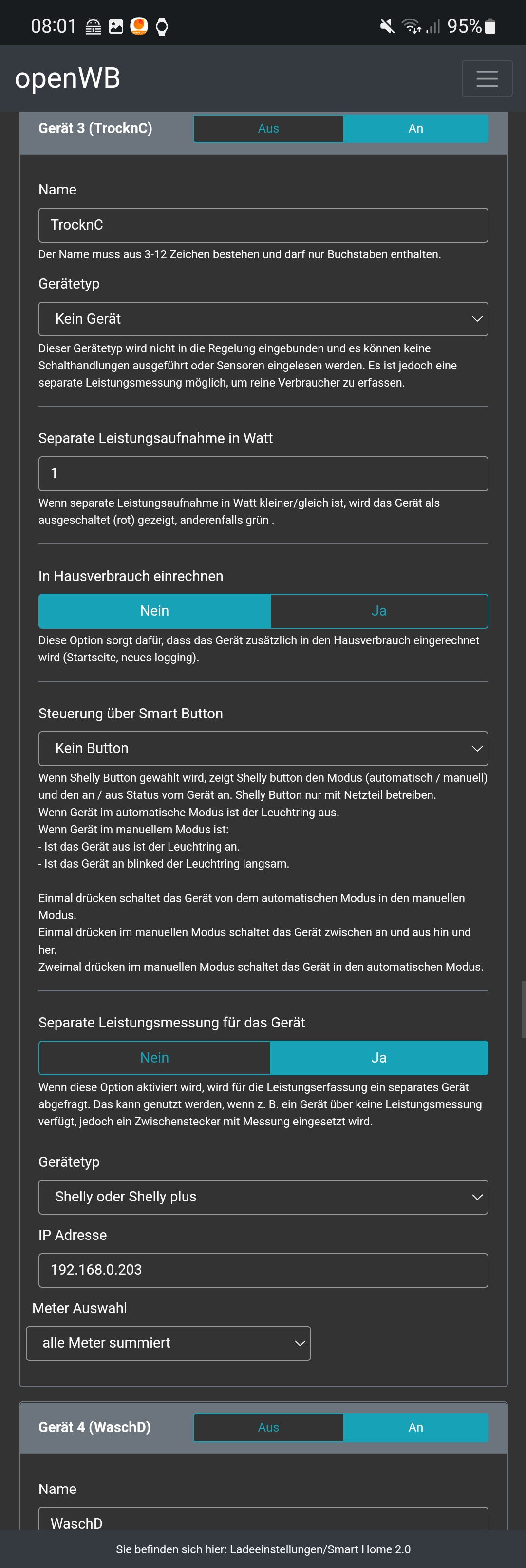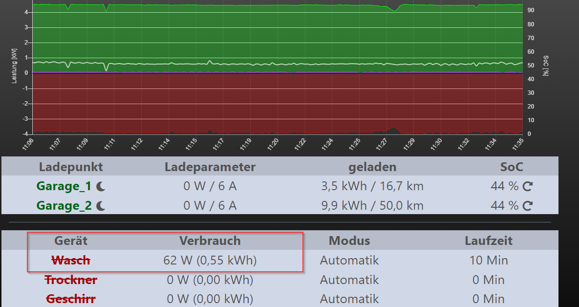 Auch wenn das Log die Fehlermeldung anzeigt, scheint es zu funktionieren. Einziges "Problem", ich würde erwarten, wenn die Rosa Linie für die Waschmaschine hoch geht auf 2kw, dass dann auch gleichzeitig der Hausverbrauch hoch geht auf über 2kw. Oder muss ich dazu "In Hausverbrauch einrechnen" aktivieren, da sonst das Gerät ähnlich wie meine Ladepunkte, nicht im Hausverbrauch auftaucht? Kurz und knapp, wenn ich eine Schwelle definieren könnte, ab wann das Gerät als "aktiv" angezeigt wird, wäre ich absolut glücklich