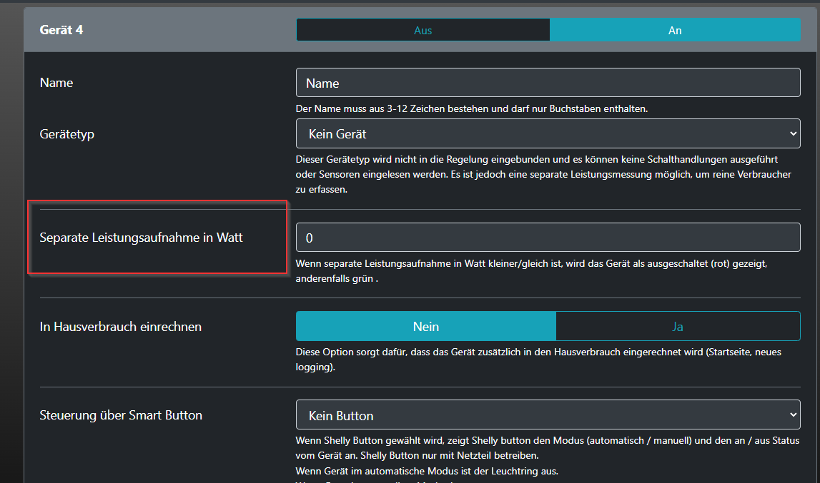 Doch, genauso wie bei "kein Gerät" gibt es bei Gerätetyp "HTTP" in SmartHome 2.0 die Separate Leistungsmessung für das Gerät (am Ende der jeweiligen Geräteeinstellungen).Diese Einstellung habe ich nicht, da der Gerätetyp bei mir HTTP. Dann ist die Einstellung "Separate Leistungsaufnahme in Watt" nicht möglich.