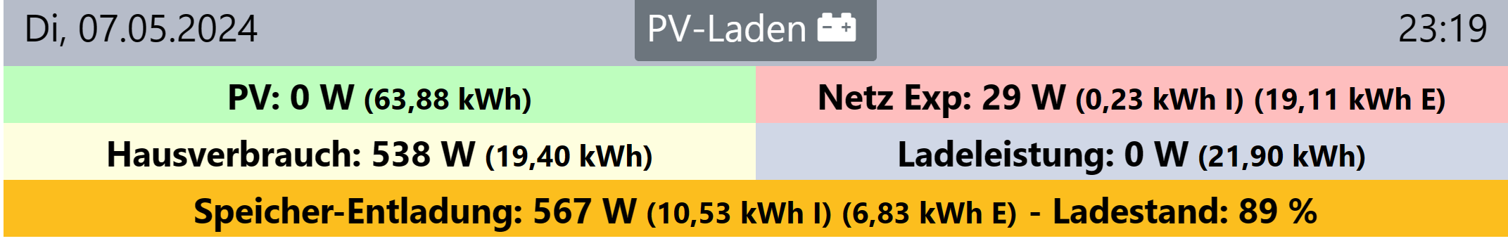 2023-01-19 16:23:51,214 - {control.counter:203} - {DEBUG:MainThread} - Überschuss zur PV-geführten Ladung: 0W
