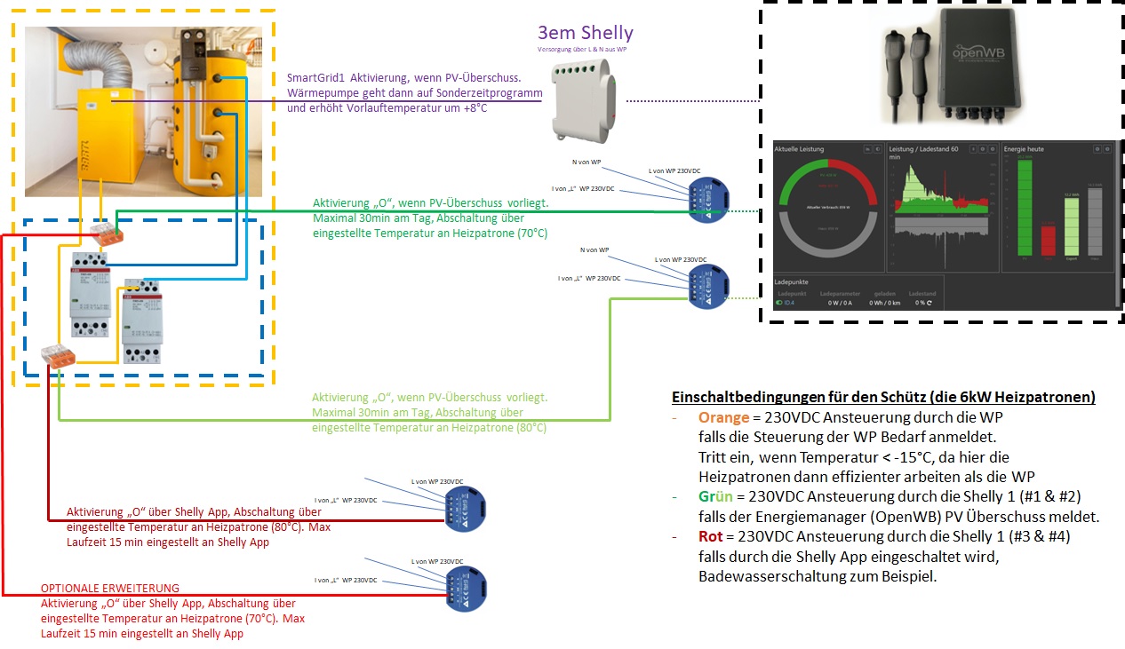 Zu meinem problem, ich könnte doch 2 Shelly 1 vor dem Schütz der Heizpatrone parallelschalten und dann einen in die open WB Steuerung mit PV Überschuß einbinden und einen eben durch die ShellyApp bedienen. Das sollte doch gehen oder habe ich einen Denkfehler?