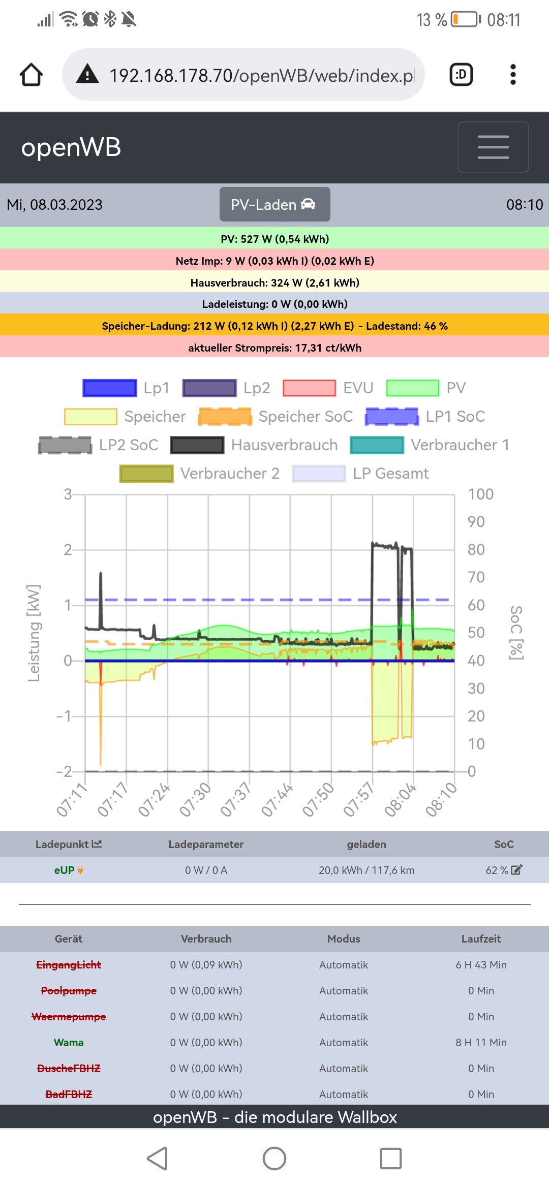 Ich habe 2 x OpenWB 2 Custom in Vollausstattung im Master/Slave-Betrieb (Display hat nur der Master). Da mein EV6 immer noch nicht geliefert wurde, haben die beiden OpenWB's eigentlich nichts zu tun und ich nutze derzeit nur die OpenWB-Colors-Darstellung, um meinem Selbstbau-Hausspeicher bei der Arbeit zuzuschauen. Ich arbeite derzeit im Homeoffice und habe eigentlich immer die OpenWB-Darstellung in einem Fenster geöffnet.