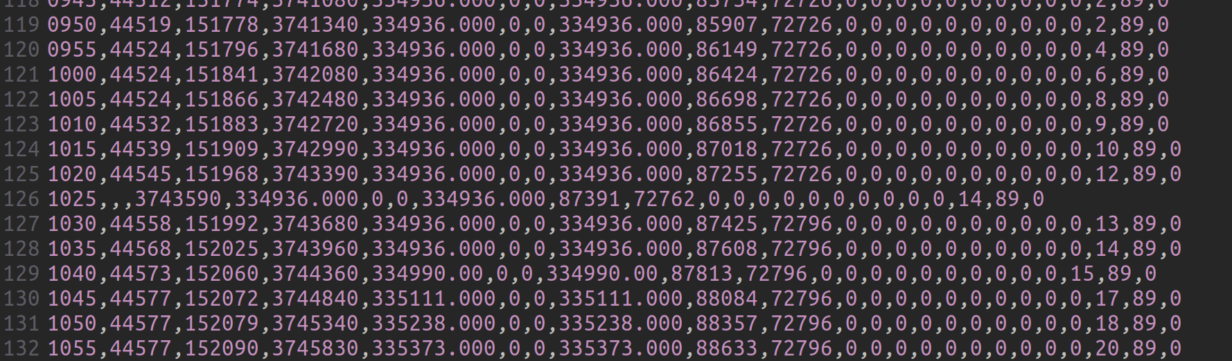 Die Dateien haben als Namen Jahr und Monat, sodass Du die betroffene Datei recht schnell findest. Die erste Spalte ist die Uhrzeit. Man erkennt aber auch rein optisch sehr schnell, dass da etwas nicht passt.