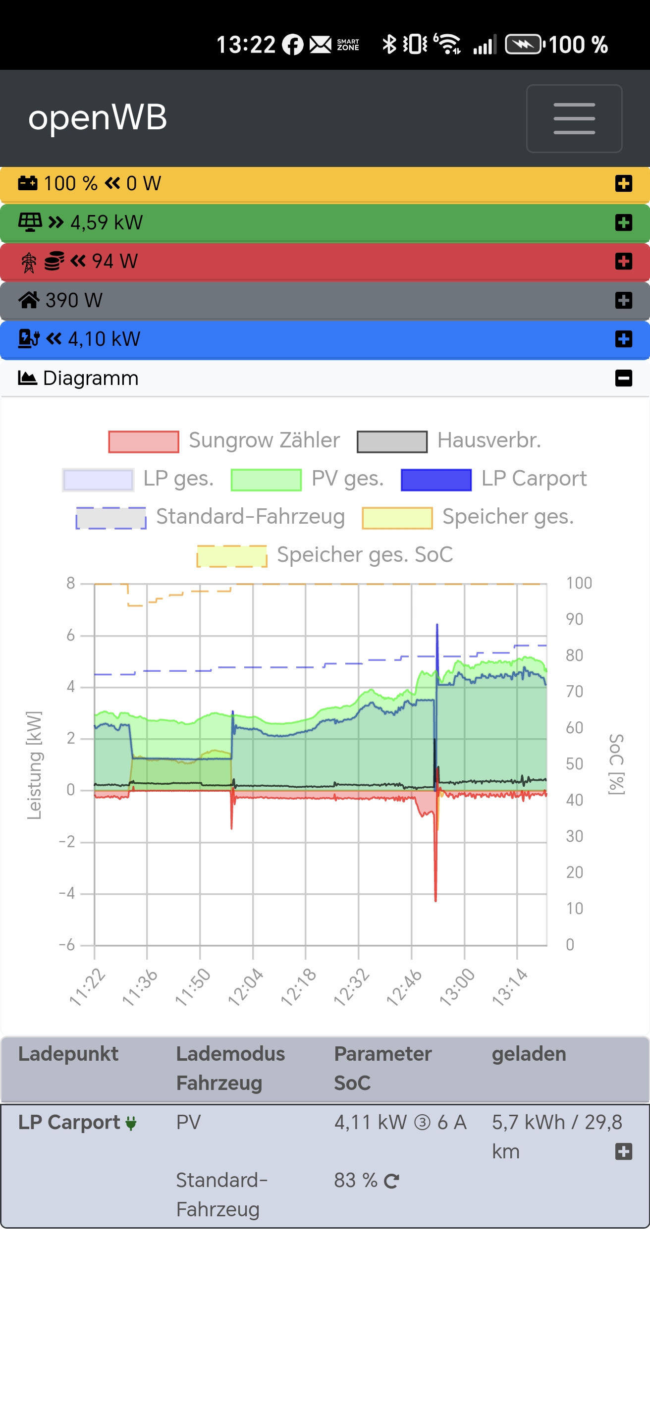 Hier noch ein Screenshot mit aktiviertem Mindesttrom 6A. Die eingespeiste Leistung geht dabei etwas runter und schwankt zwischen 20 und 220 Watt bei 3-phasigem Laden. Habe den Mindesttrom 6A um 12.55 Uhr aktiviert.
