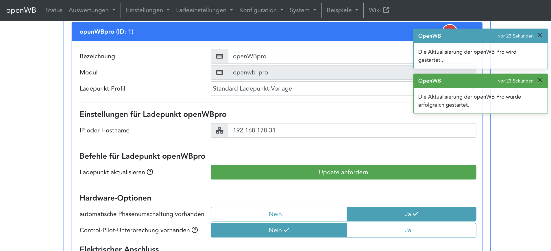 Ist die Version noch nicht aktuell kann über die steuernde openWB software2 das Update im Bereich der Ladepunktkonfiguration angestoßen werden.