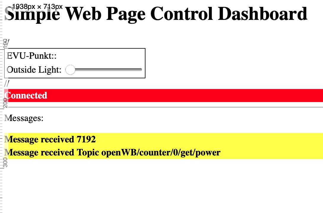 Da habe ich dann seine Beispielseite heruntergeladen und dann ein bisschen modifiziert, so dass ich aus einer openWB2.1 den EVU-Punkt auslesen konnte. Das kommt an, allerdings noch nicht in dem richtigen Feld. Ich denke mal, seine Seite funktionert so, dass man mit dem Eingabedinx und dem slider Werte publishen kann. Das mit dem EVU-Punkt ist beim rumspielen ein bisschen kaputt gegangen. Die anderen angepassten Stellen findest Du mit der Suche nach "openWB"