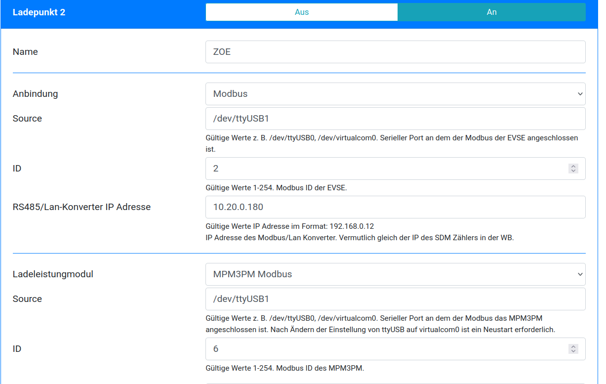 Nachdem mir ein RS485/USB Konverter kaputt gegangen war habe ich die IDs vom 2. Ladepunkt geändert und die Konfiguration des 2. Ladepunktes entsprechend umgestellt:.