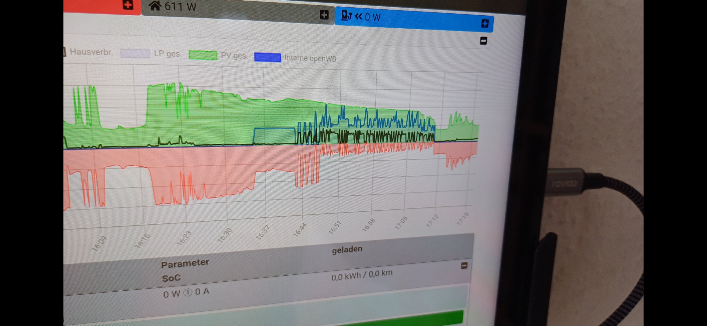 Jetzt ist wirklich "schön" zu sehen, wie die Schwankungen des Hausverbrauches anfangen, sobald 3 phasig geladen wird. Des weiteren sieht man, dass vor dem 3phasigen laden und nach dem 3phasigen laden, die Schwankungen des Hausverbrauches nicht vorhanden sind.