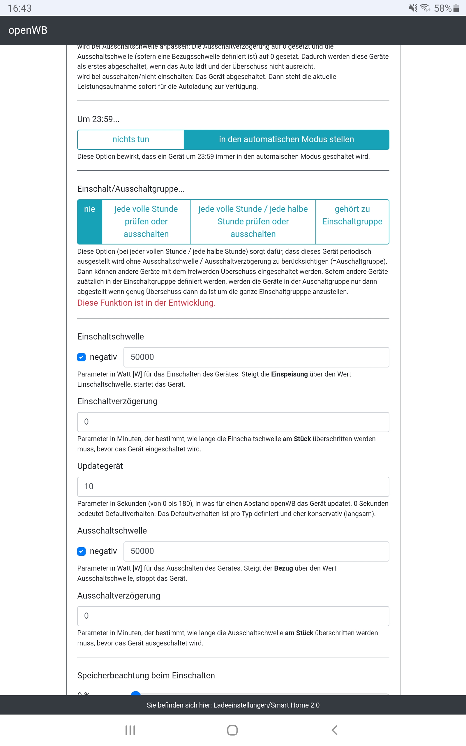 Der Smarthomedevice sollte irekt Einschalten wenn kein Auto lädt (grün in der Anzeige und 100 Watt verbrauch